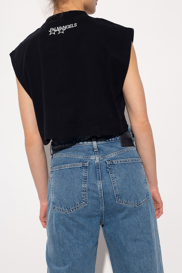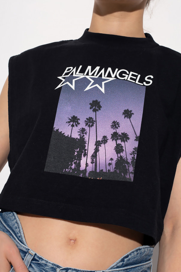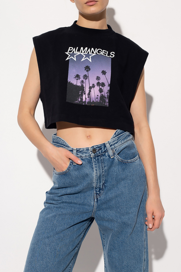 Black sleeveless crewneck T-shirt from Palm Angels. Crafted from cotton with a cropped fit, this style features an elasticated collar and a graphic print with an accompanying logo.