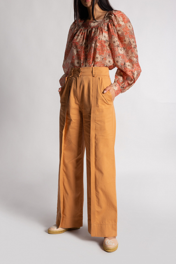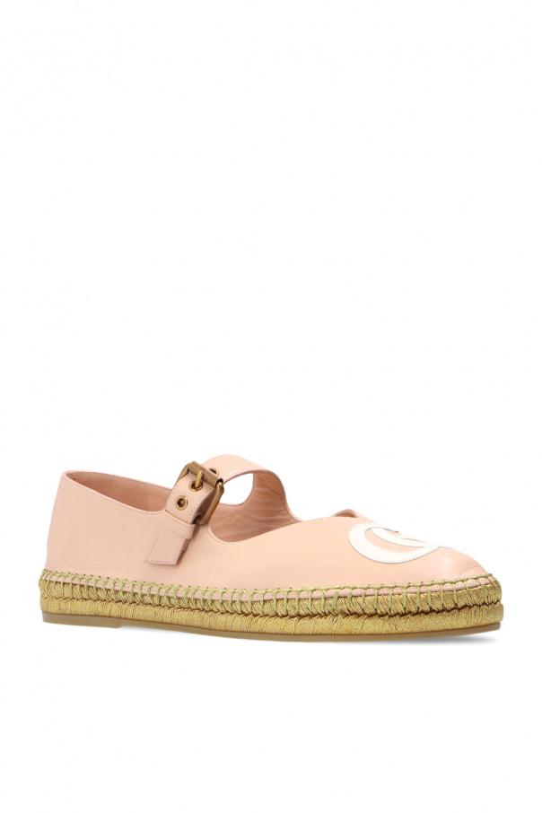 Beige espadrilles from Gucci. Crafted from leather, they sit on a beige rubber sole and showcase a buckle strap fastening, gold-tone stitching and white logo detailing.