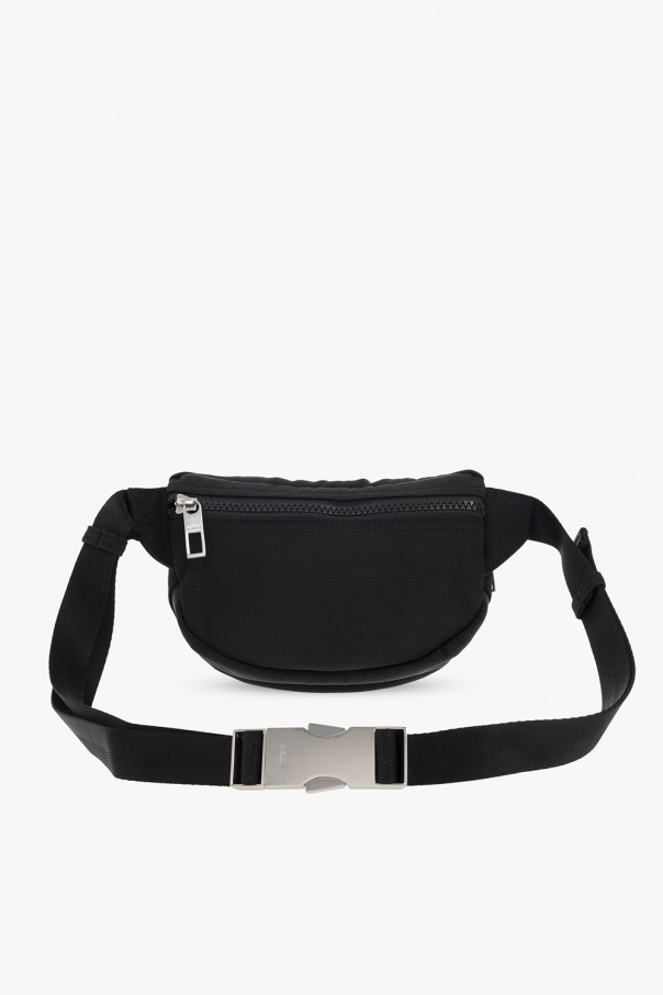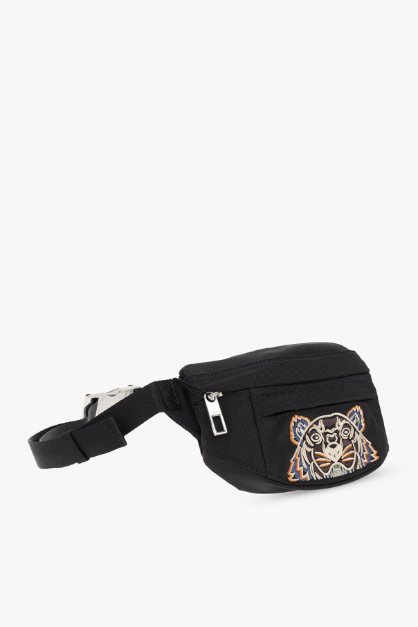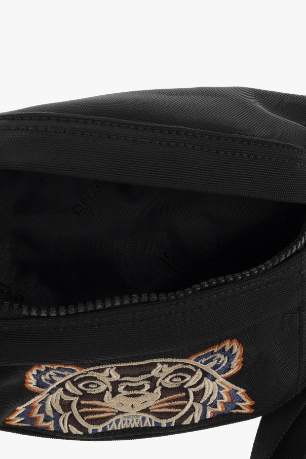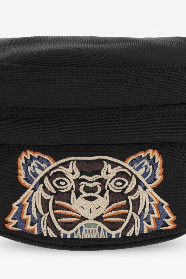 Black belt bag from Kenzo. Flaunting colourful graphic embroidery with the brand's signature tiger's head on the front, this design features a dark blue logo stitched at the top, zip pockets on the front and back, an adjustable strap with a metal buckle, silver-tone metal hardware and one internal compartment.