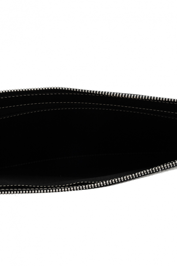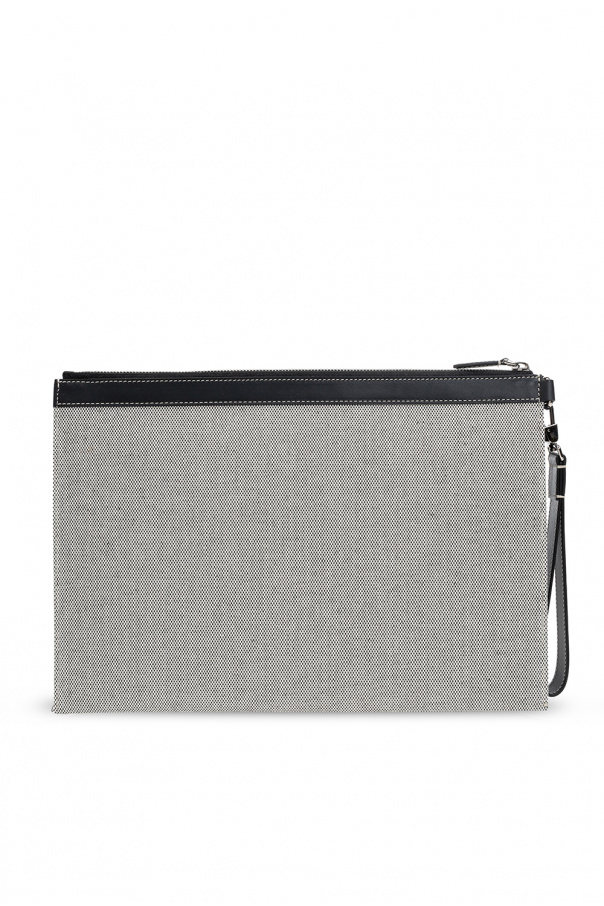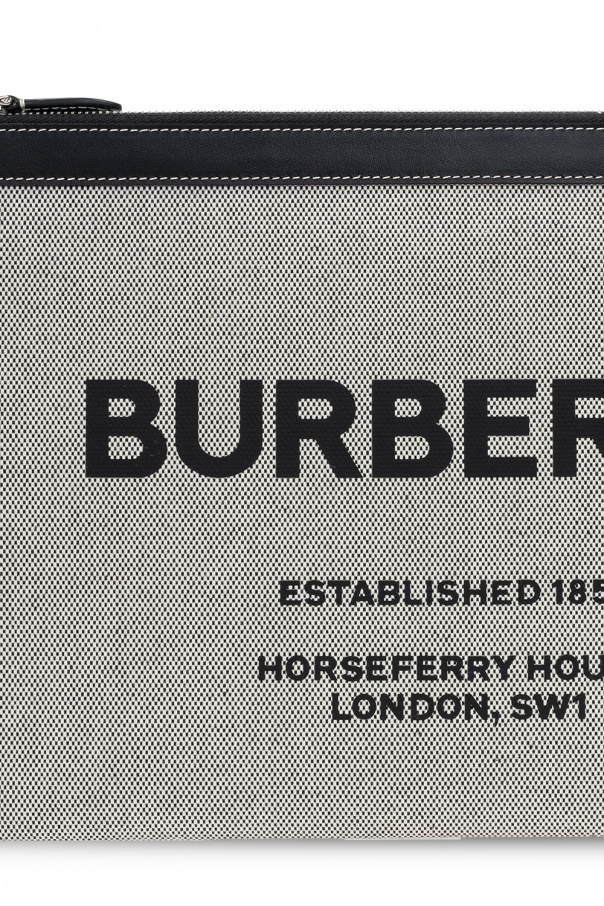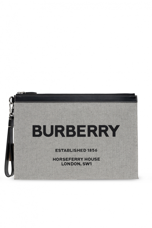 White and black handbag from Burberry. Crafted from cotton, this design fastens via a zip and showcases a black graphic print with the brand's logo, a wrist strap, silver-tone metal hardware and one internal compartment with a slip pocket.
