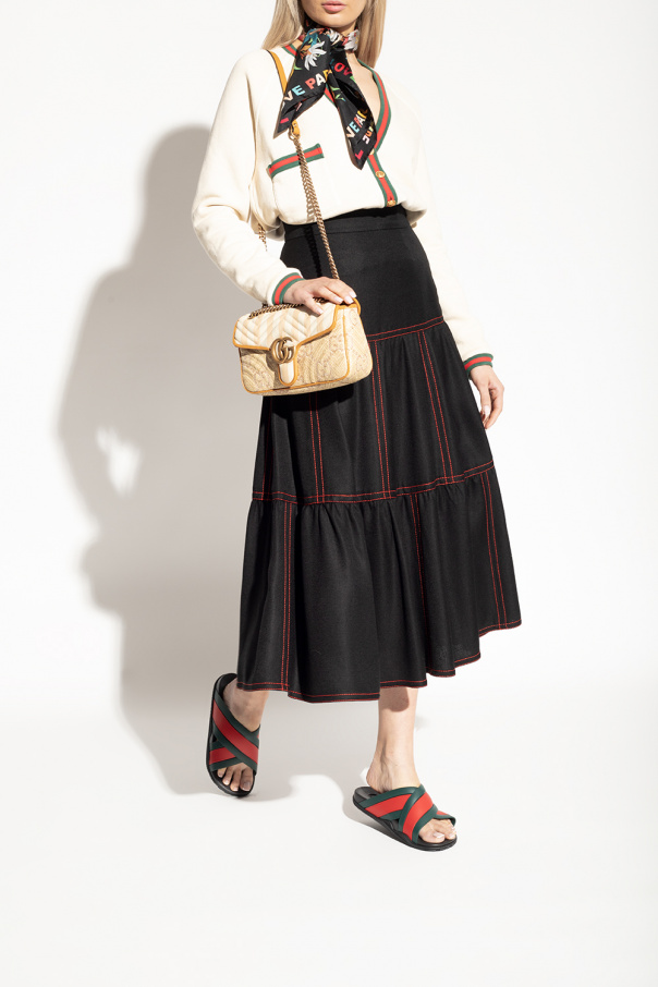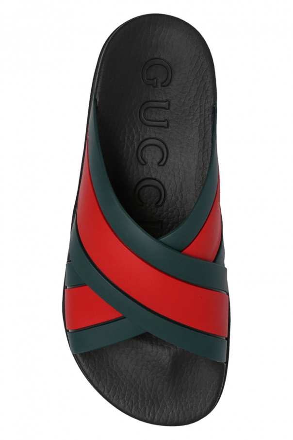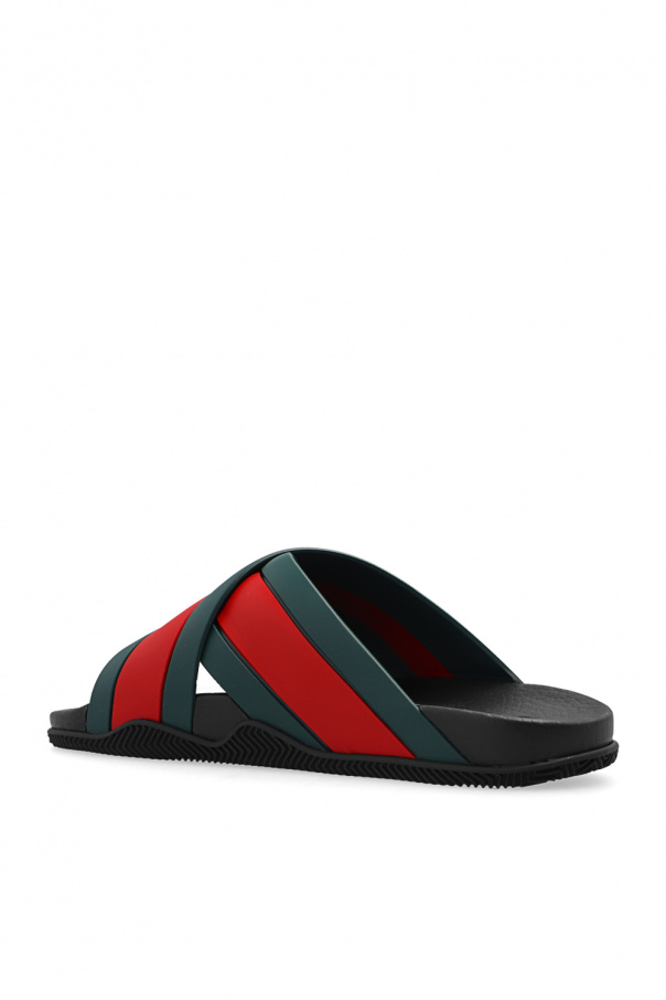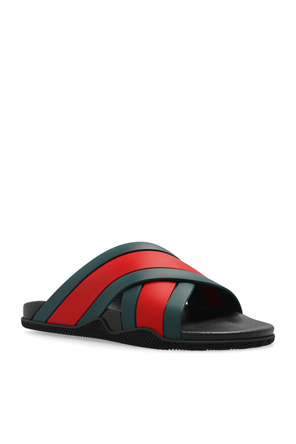 Green, red and black slides from Gucci. Made of rubber, this pair is complete with the brand’s signature Web stripes and black rubber sole.