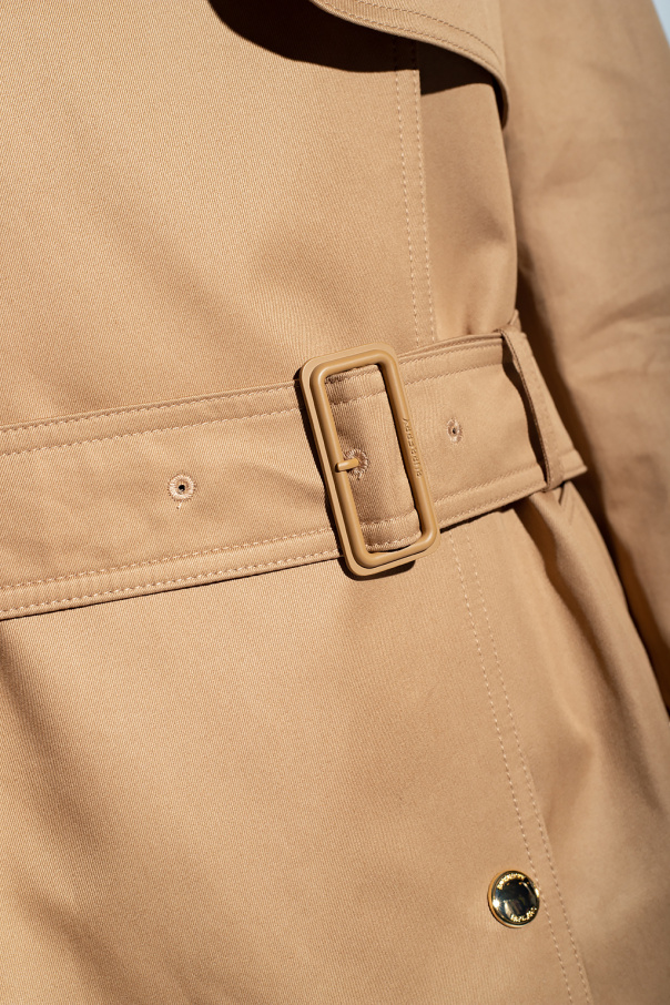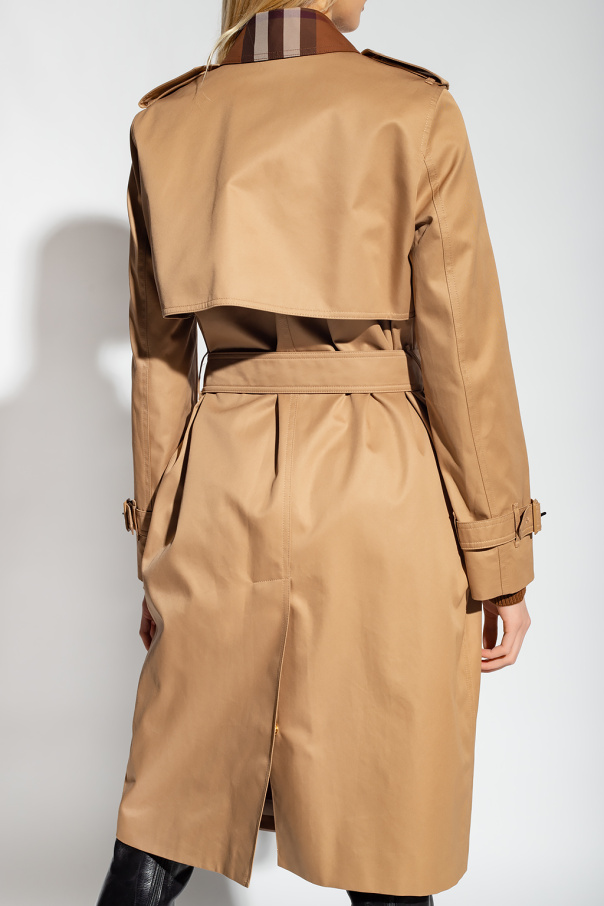 Beige ‘Sandridge’ trench coat from Burberry. Crafted from cotton with a double-breasted silhouette, this style features gold-tone snap closures with an engraved logo, a waist-cinching buckle belt, shoulder epaulettes, two snap-fastened pockets on the front, long sleeves, a single back vent and a brown collar and lining showcasing the brand's iconic colourful check pattern.