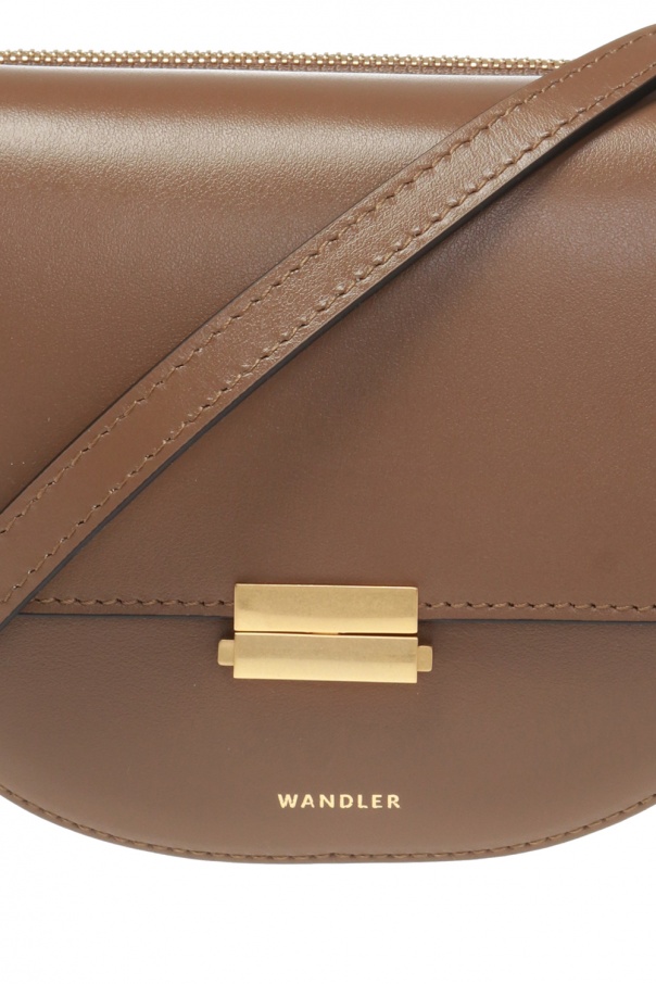 Brown ‘Anna Big’ belt bag from Wandler. Made of calf leather. Metal snap fastening. Front decorated with a gold-tone logo print. Zip pocket at the back. Adjustable shoulder strap. Main internal compartment with a card slot. Gold-tone metal hardware.