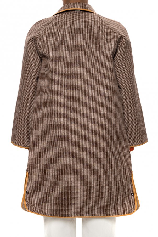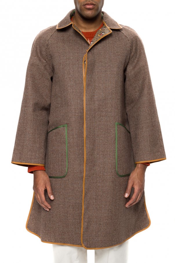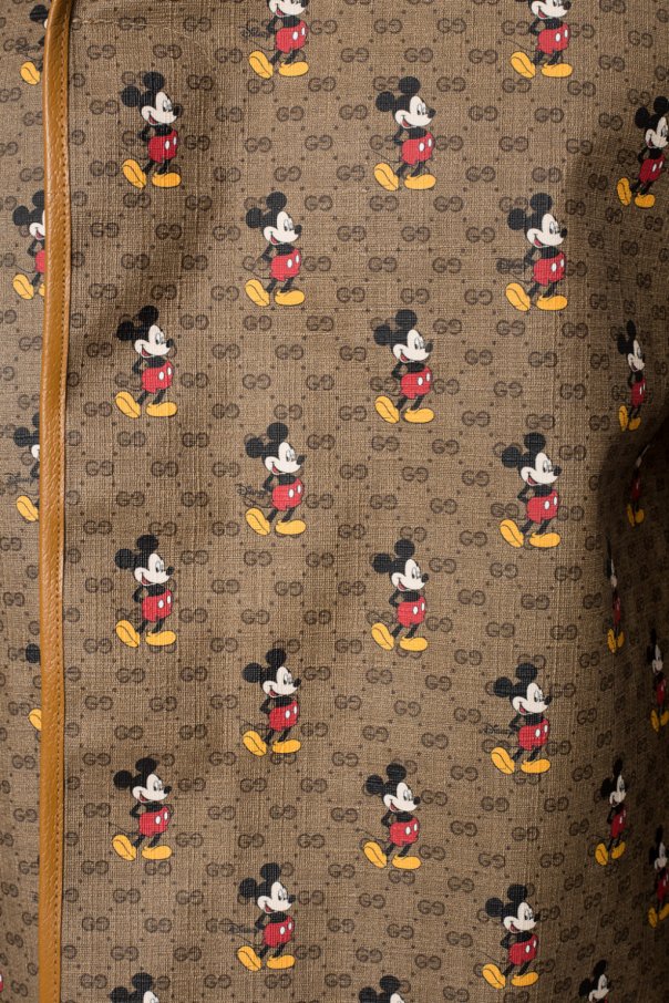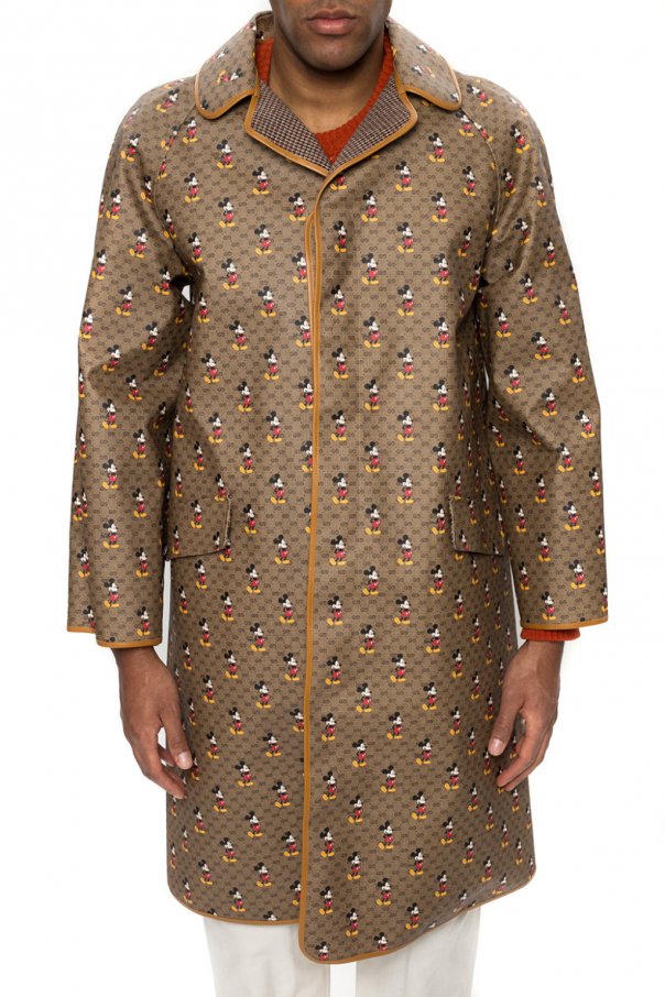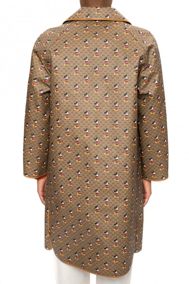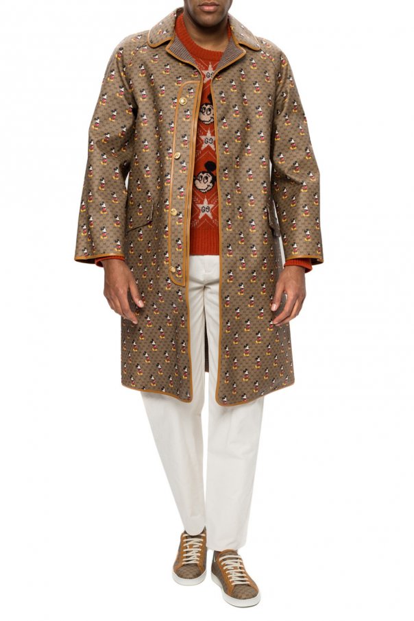 Brown coat from Gucci x Disney. Made of ‘GG Supreme’ canvas. Fastened with buttons. Decorated with a ‘Mickey Mouse’ print. Features two flap pockets. Lining made of wool.