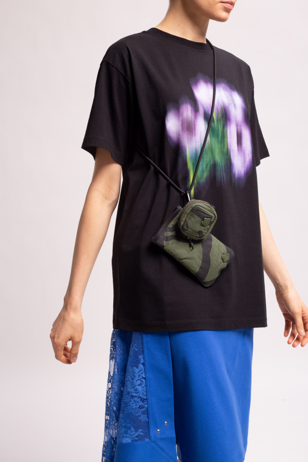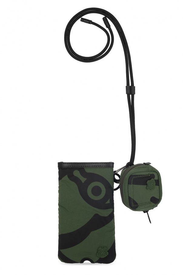 Green and black phone holder on a strap from Kenzo. Decorated with the label’s signature tiger head patch, this item is complete with a detachable strap and zipped headphones case.