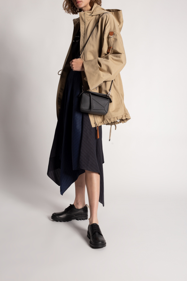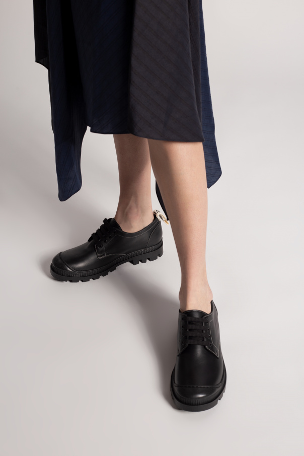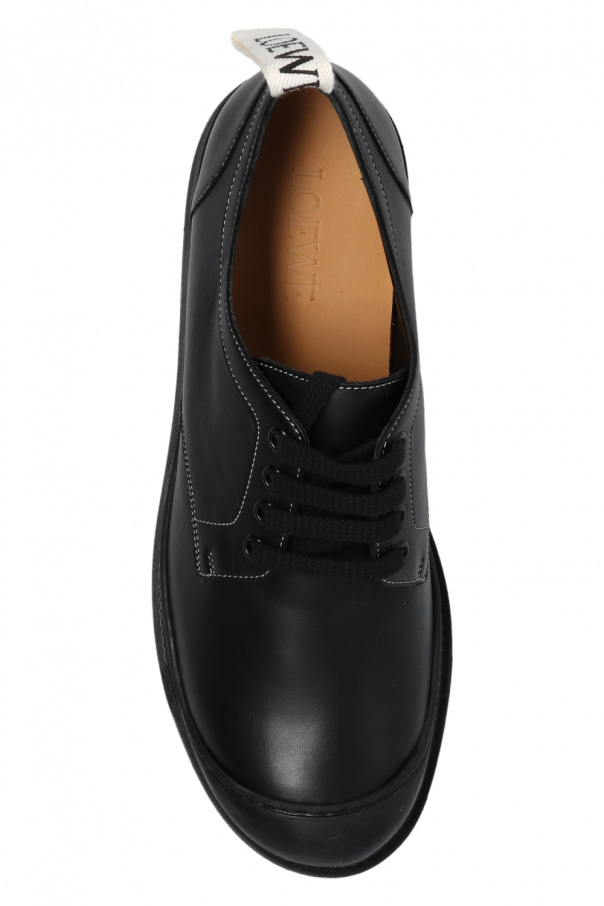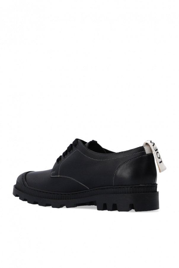 Black Derby shoes from Loewe. Made of leather, this lace-up model sits on a black rubber sole and showcases distinctive stitching and a beige grosgrain pull tab with a printed logo on the back.
