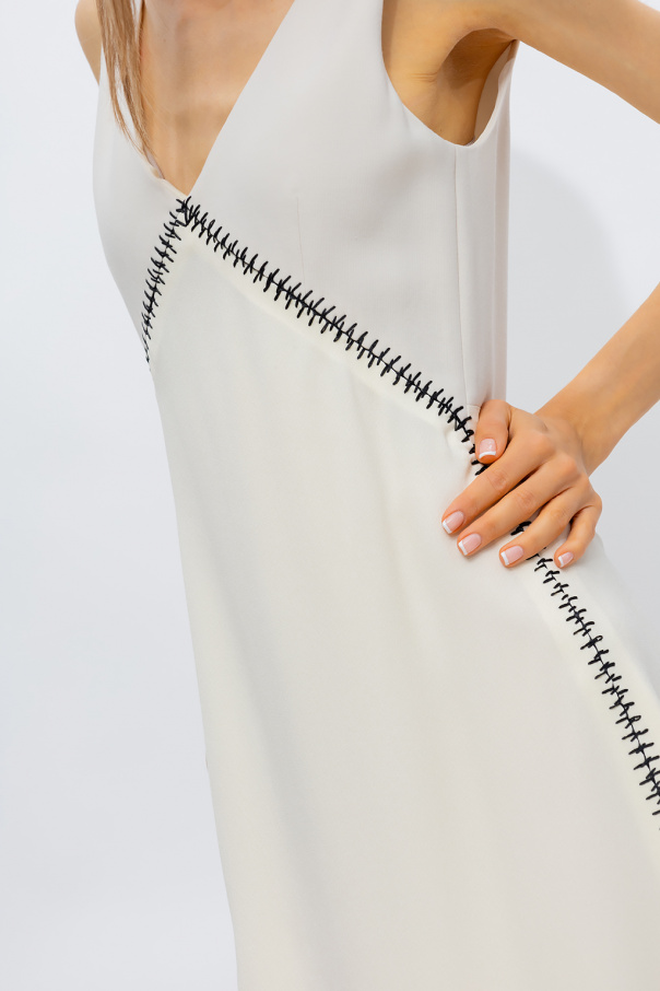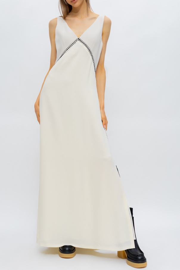 Cream maxi sleeveless dress from Chloe. Made from wool, this style features a back zipper with a hook & eye closure, an empire waist with contrasting black stitching details, a back & front V-neckline, and fringed slits on the sides.