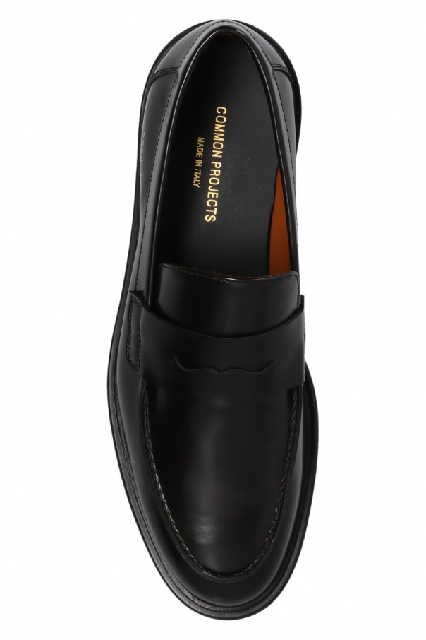 Dark brown loafers from Common Project. Made of leather, this model features a gold-tone print on the side and a leather sole in brown and black.
