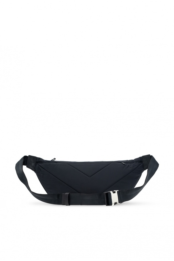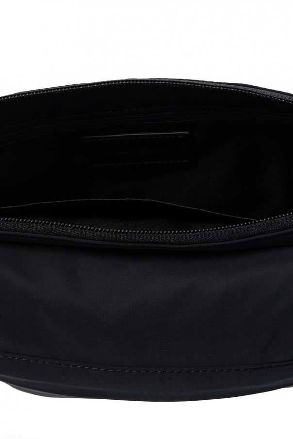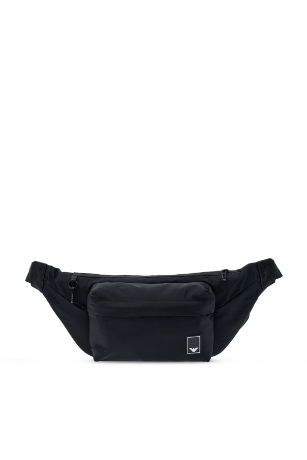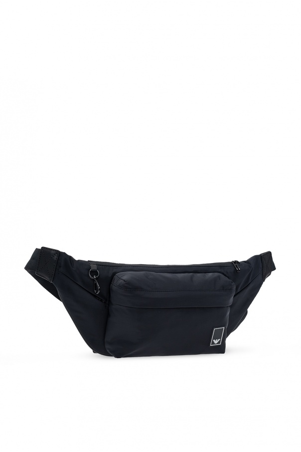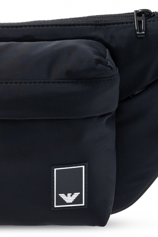 Black belt bag from Emporio Armani. Fastened with a zip, this design features a logo patch, front zip pocket, adjustable belt, black metal hardware and one internal compartment with one zip pocket.