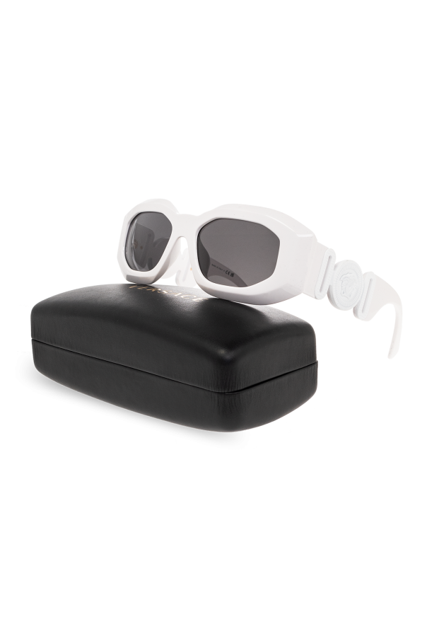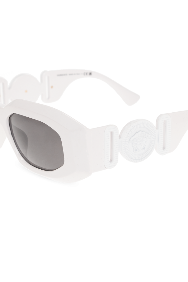 White sunglasses from Versace, ‘La Vacanza’ collection. This pair features a thick frame with a single bridge and integrated nose pads, temples with the brand’s signature Medusa head detail and grey lenses with UV protection. Case included.