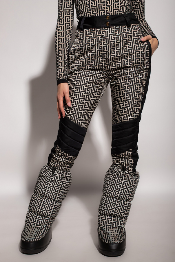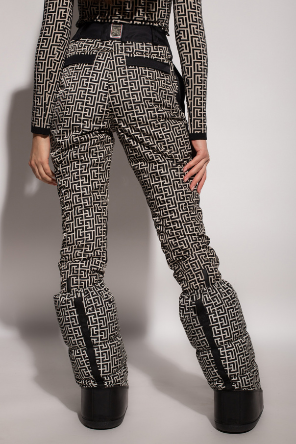 Black and white ski trousers from Balmain x Rossignol. Crafted from PrimaLoft – a synthetic microfiber thermal insulation material with waterproof properties, this pair showcases an all-over monogram pattern. It is complete with a zip fly with a hook and snaps, four zipped pockets (two on the front and two on the back) and elasticated cuffs with zipped vents.