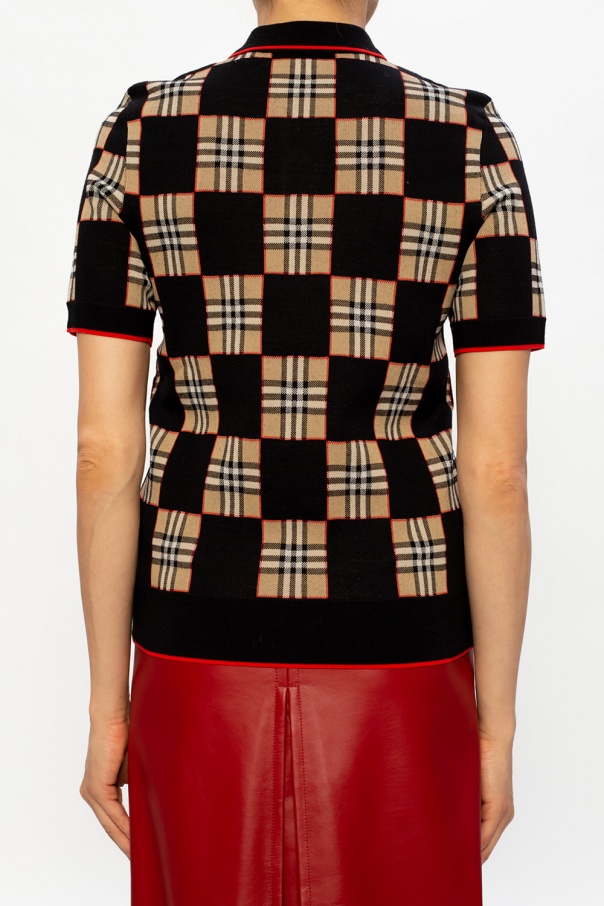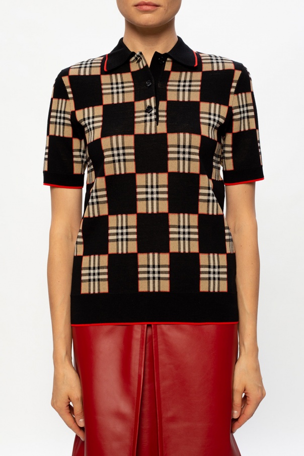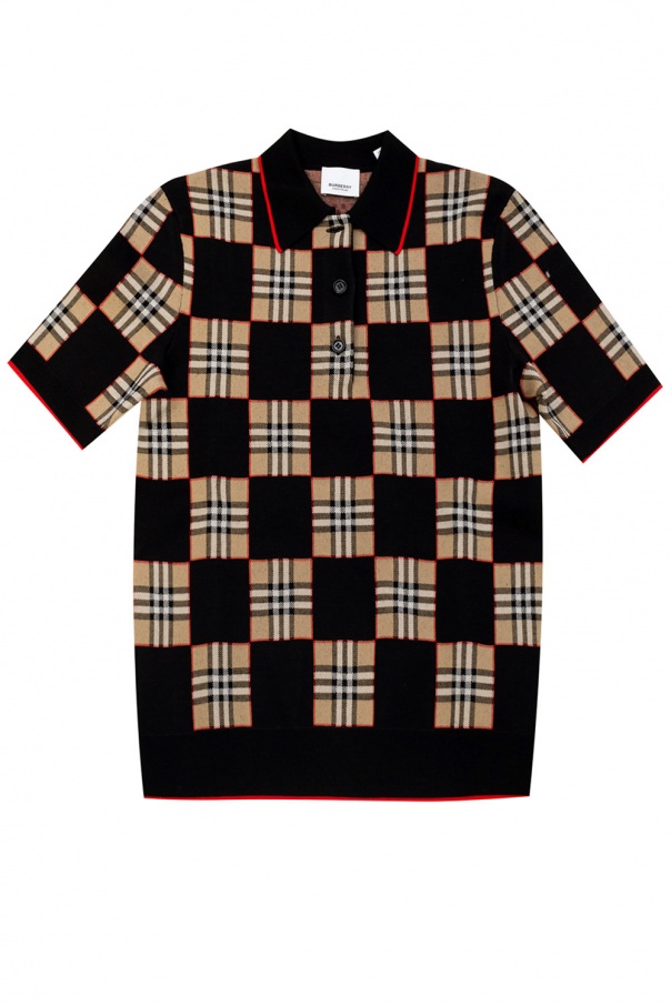 Beige and black polo shirt from Burberry. Cut from merino wool blend with the label's trademark check pattern, this short-sleeved style fastens via three buttons at the neckline.