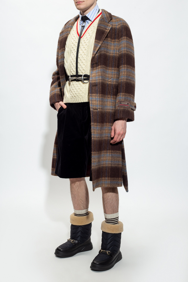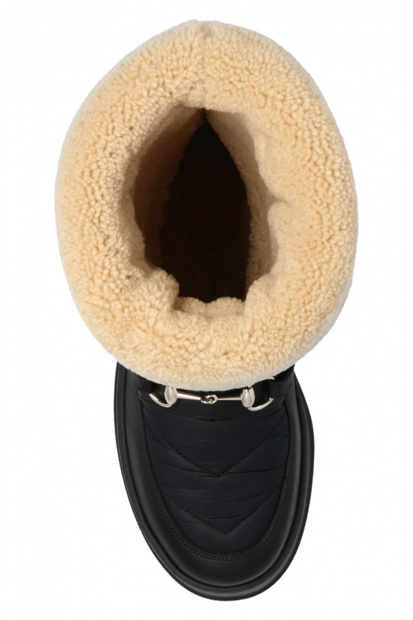 Black snow boots from Gucci. Crafted from quilted chevron nylon, this model sits on a black rubber sole and showcases signature gold-tone horsebit hardware on the front and a merino wool lining.