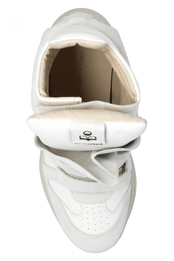 Light grey, cream and white ‘Balskee’ wedge shoes from Isabel Marant. Made of leather and suede, this model features a velcro closure, logo patch on the front and side as well as a cream rubber sole.