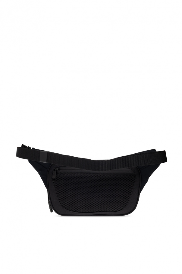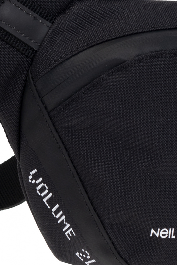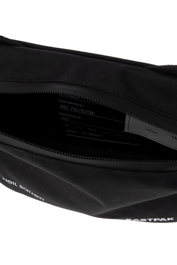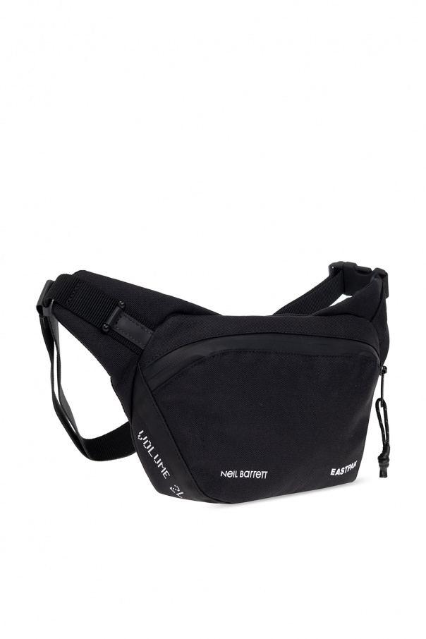 Black belt bag from Neil Barrett x Eastpak. Crafted from durable canvas, this design secures with a zip and features a white logo print, a back zip pocket, an adjustable strap and one internal compartment.
