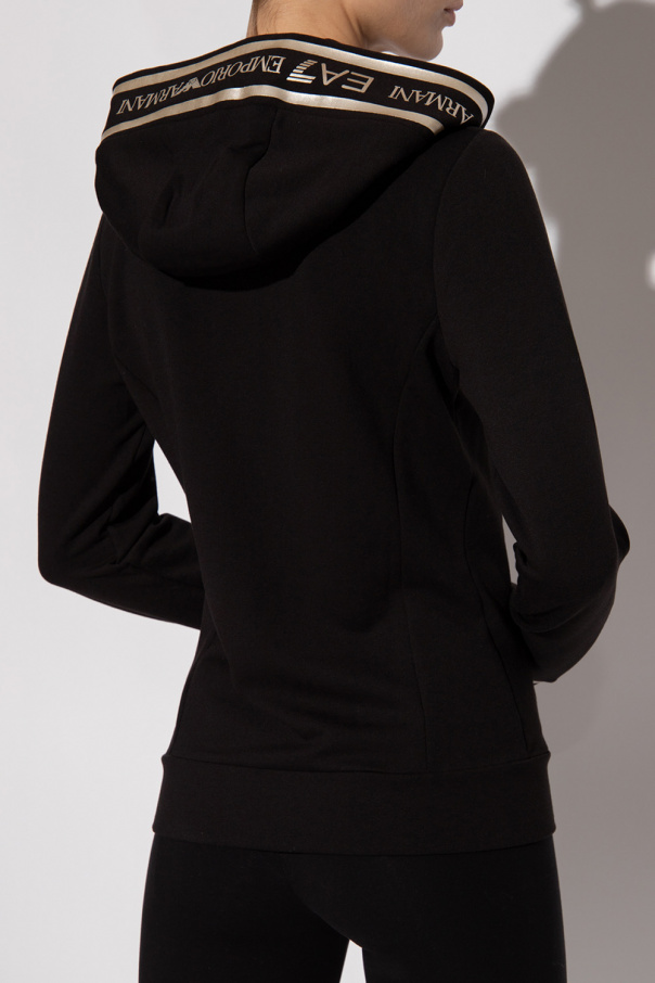 Black hoodie from EA7 Emporio Armani. Printed with gold-tone stripes with the label's logo, this style features a zip fastening, two frontal pockets and an elasticated bottom hem and cuffs.