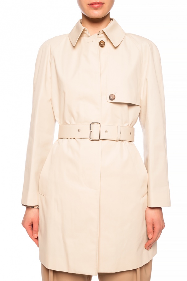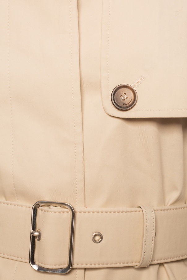 Cream trench from Salvatore Ferragamo. Made of cotton. Fastened with buttons. Two slip pockets on the front. Single rear vent. Lining decorated with the Gancini pattern. Comes with a belt.
