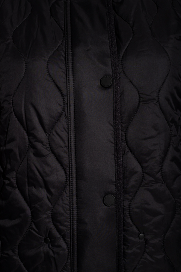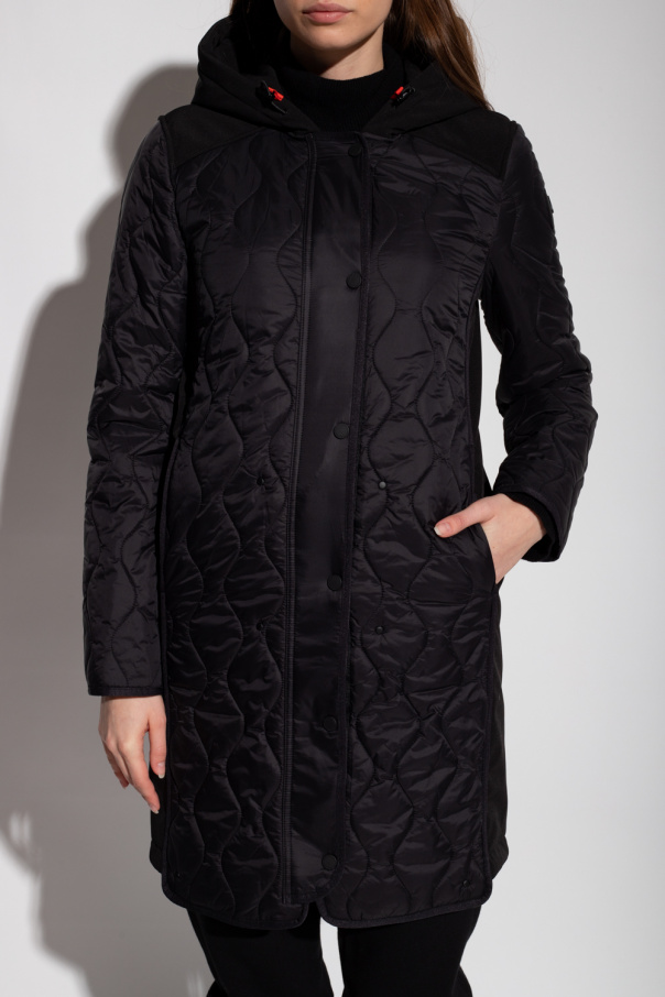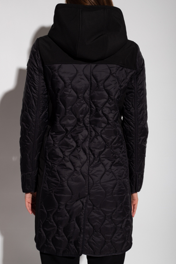 Black ‘Manhattan’ coat with a drawcord-adjustable hood from Moose Knuckles. Offering insulating, waterproof and breathable properties, this style secures with a two-way zipper and snaps and features quilted detailing, a rubber logo patch, long sleeves with snap closures, two slip pockets as well as padding from recycled plastic and eco material Sorona®.
