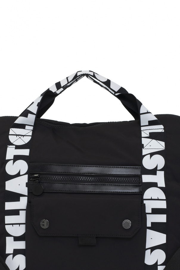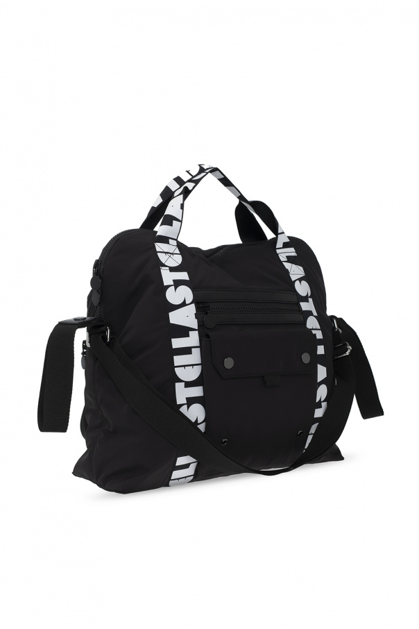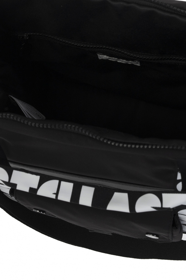 Black changing bag from Stella McCartney Kids. Made of recycled fabric, this model fastens with a two-way zip and is decorated with a white logo print. It features a zip pocket and flap pocket with magnetic snaps on the front, back pockets with a two-way zip, two half-round handles, adjustable straps, snaps on the sides and silver-tone metal hardware. It has one internal compartment with two slip pockets, one zip pocket and flap pocket with a magnetic closure inside. Comes with a changing mat.