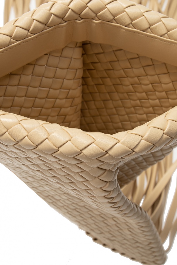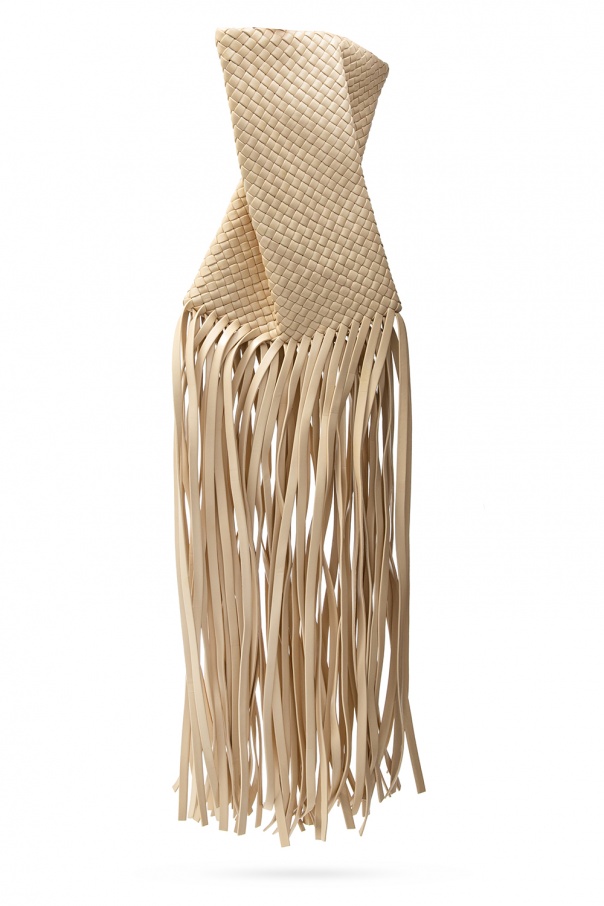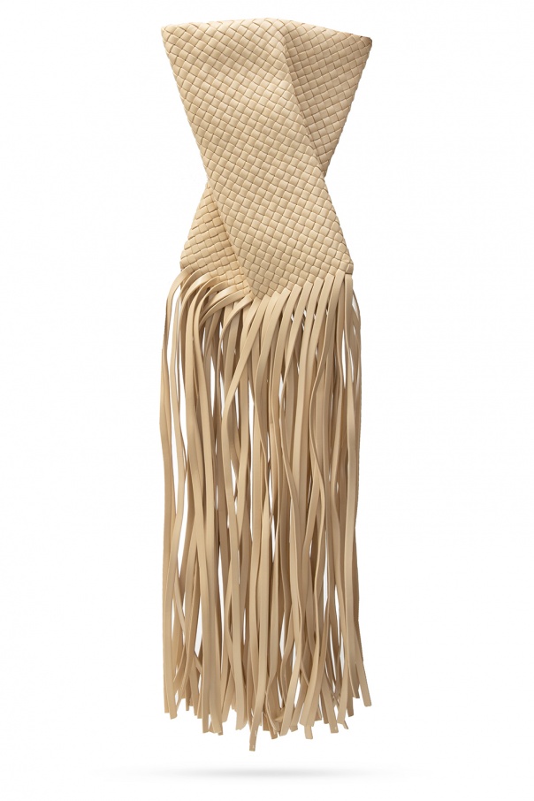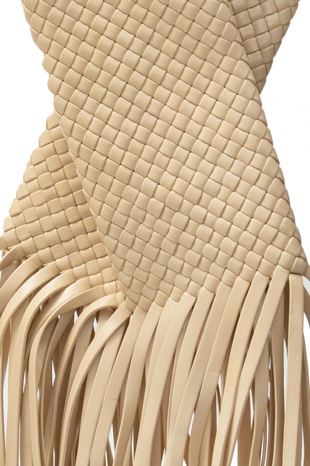 Beige ‘Fringe Crisscross’ clutch from Bottega Veneta. Crafted from lamb leather, this style showcases the label's iconic ‘Intrecciato’ weave and elongated fringe detailing and has snap fastening and one internal compartment.