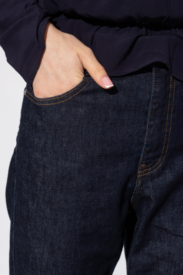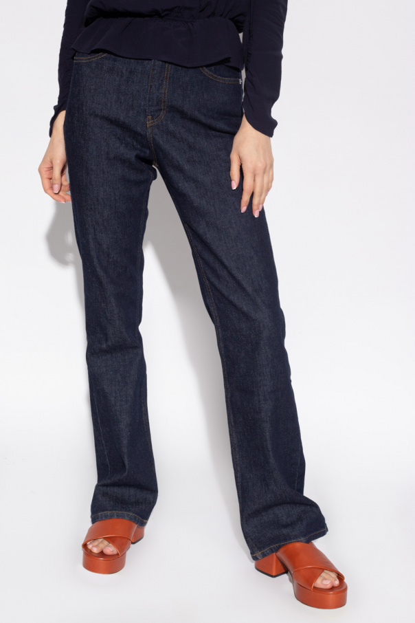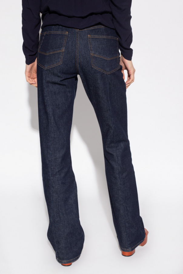 Navy ‘Poete’ jeans from Zadig & Voltaire. Fastened with a zip and button, this flared design features a logo embroidery on the side, brown patch at the back, three front pockets and two back pockets.