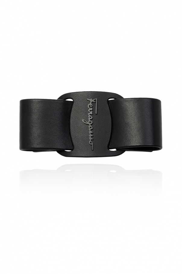 Black hair clip from Salvatore Ferragamo. This item is enriched by a leather bow, embossed logo and silver-tone metal hardware.