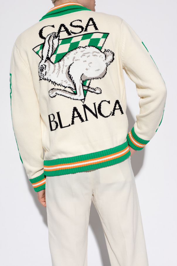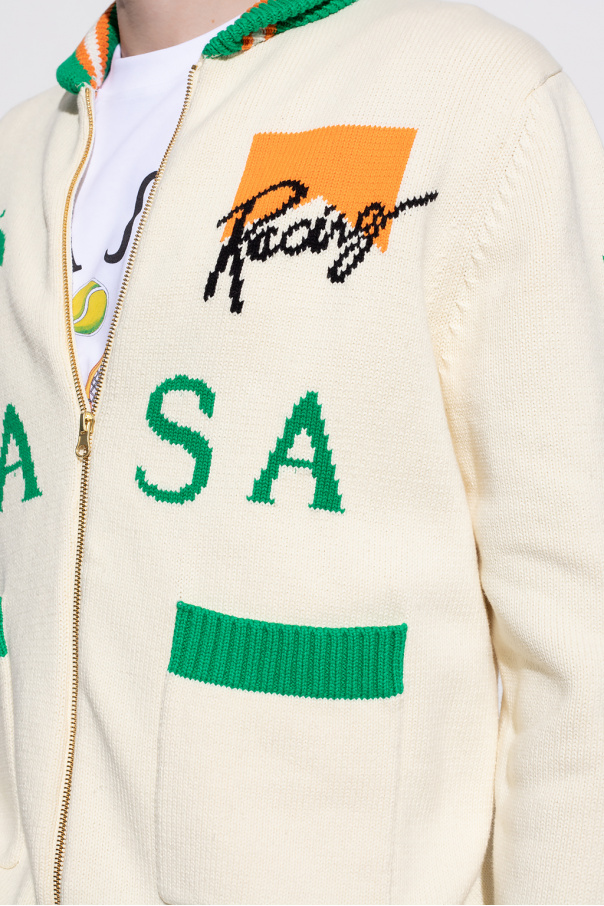 Cream, green and orange cardigan from Casablanca. Made of cotton, this garment features a gold-tone zip, embroidered logo pattern, two slip pockets and ribbed trims.