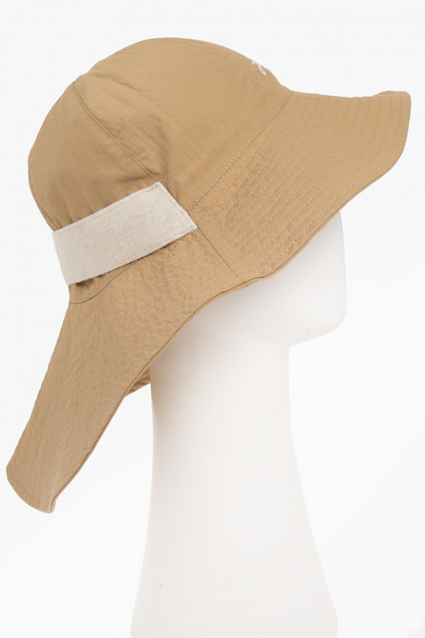 Beige ‘Pescadou’ bucket hat from Jacquemus. Embroidered at front with a white logo, this item features a prolonged back hem with a decorative cream strap.