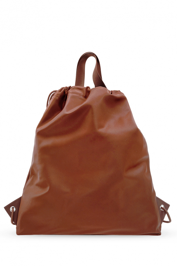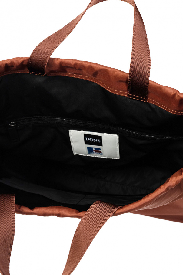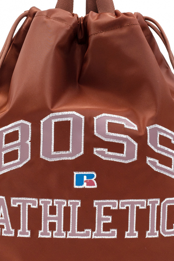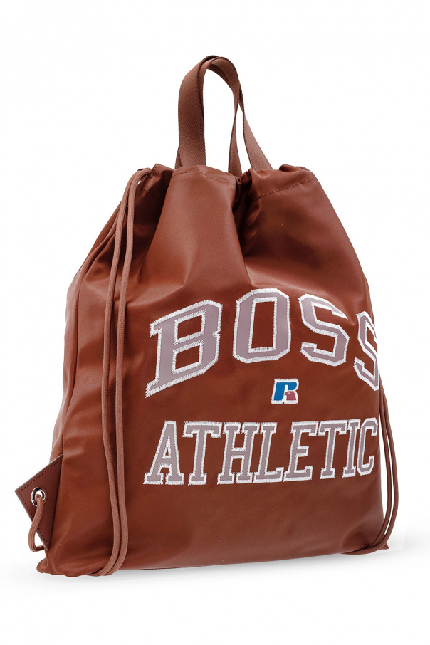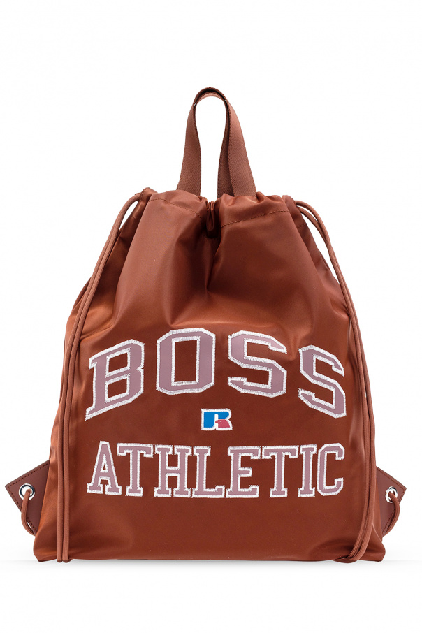 Brown backpack from BOSS x Russell Athletic. Fastened with drawstrings, this model features a logo embroidery in cream, blue and red, two half-round handles, adjustable shoulder straps and one internal compartment with one zip pocket. The collaboration presents bold, off-court classics that combine relaxed fits, sporty details, and a retro-inspired colour palette.