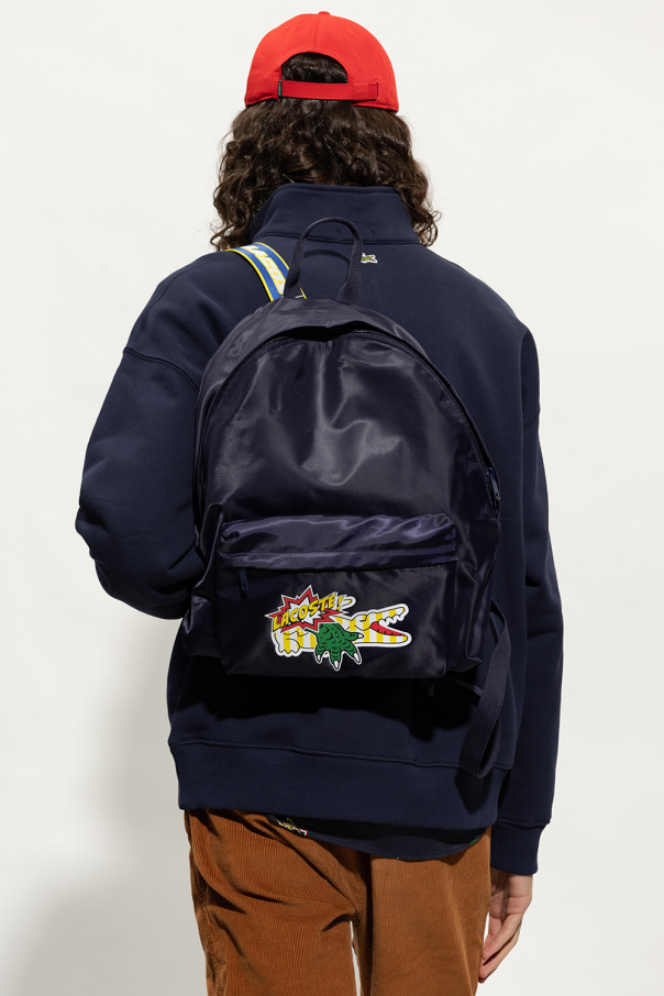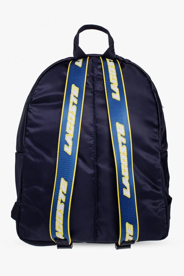 Navy backpack from Lacoste. Made of recycled fabric with a shiny finish, this model is complete with a two-way zip, multicolored logo print, front zip pocket, adjustable shoulder straps in yellow, white and dark blue and one internal compartment with three slip pockets and one zip pocket.