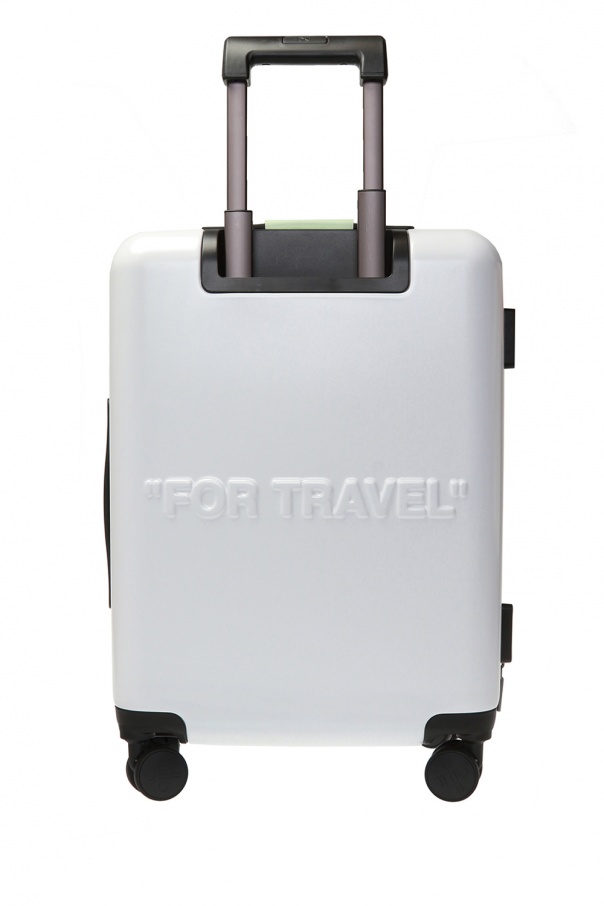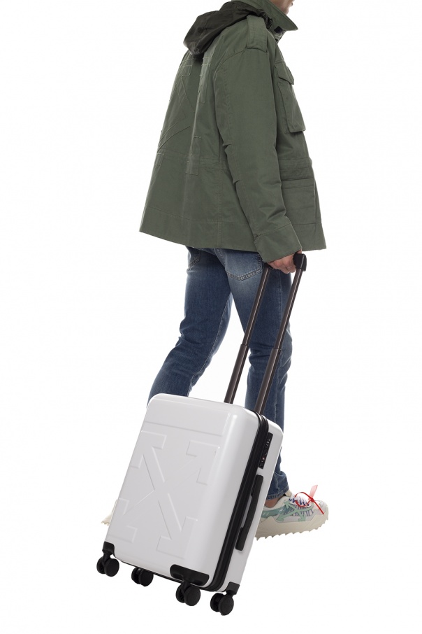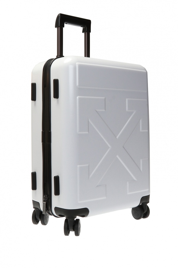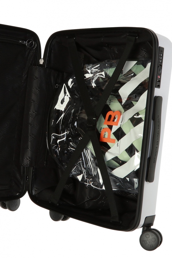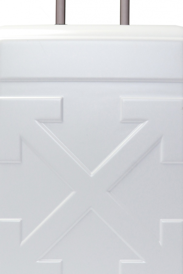 White and black suitcase with spinner wheels from Off-White. Fastened with a two-way zip with a code lock. Decorated with an embossed logo pattern. Two handles – one with a pull-up feature. Two compartments and a zip pocket inside.