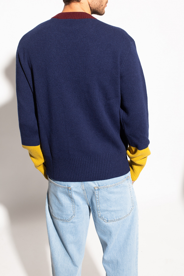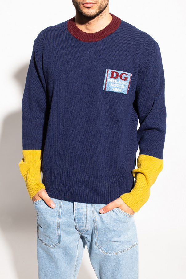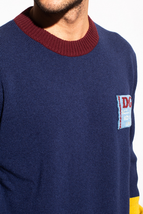 Navy blue, yellow and maroon crewneck sweater from Dolce & Gabbana. Crafted from wool, this style showcases blue, white and maroon embroidery with the brand's logo and ribbed trims on the collar, bottom hem and cuffs.