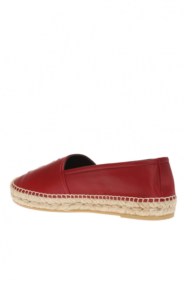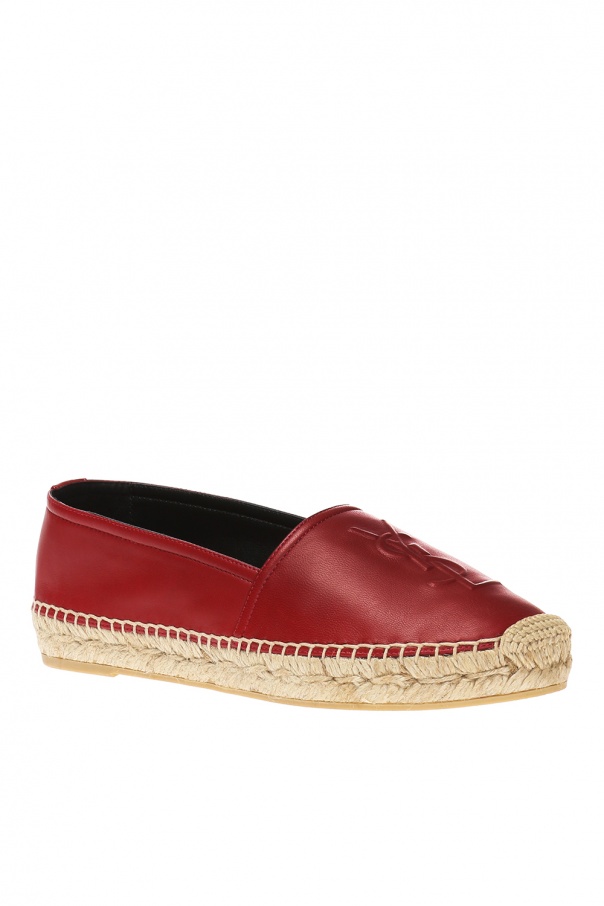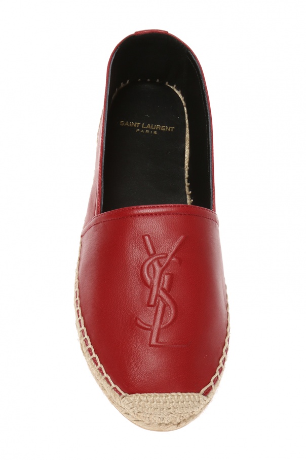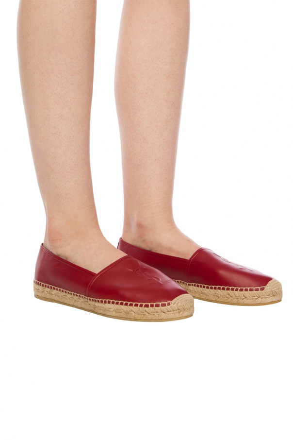 Red espadrilles from Saint Laurent. Crafted from textured lamb leather, these shoes feature an embossed logo detail and a beige rubber sole.