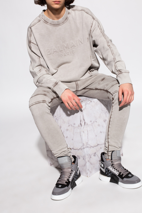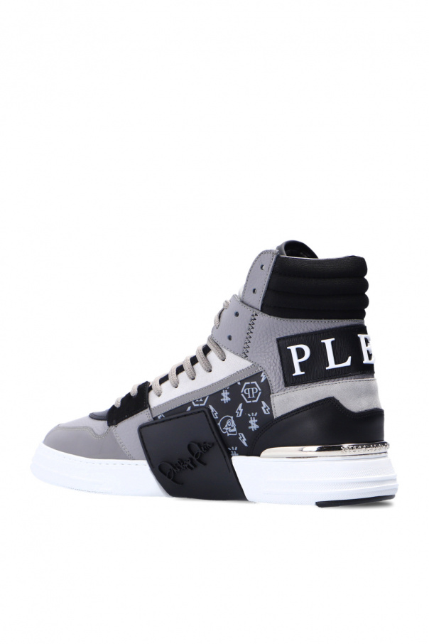 Black, grey and white ‘Phantom Kick$’ high-top sneakers from Philipp Plein. Crafted from leather and fabric, this design features a white rubber sole and an embossed, embroidered and printed logo patterns in white.