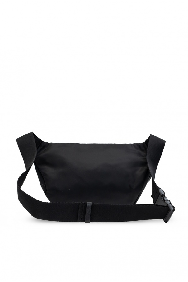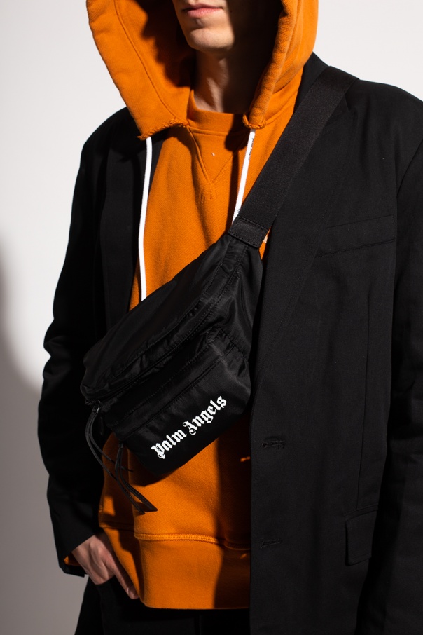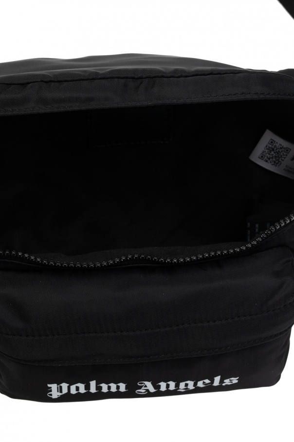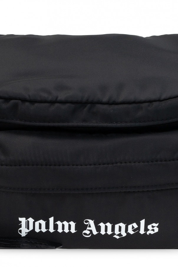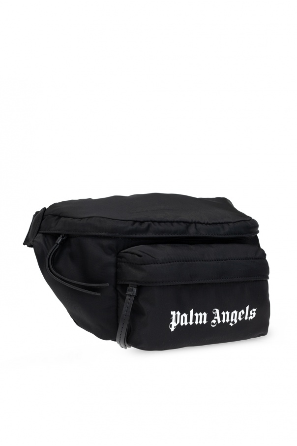 Black belt bag from Palm Angels. Printed with the brand's logo in white, this item fastens via a zip with leather fringes and features a zip pocket on the front, an adjustable strap and one internal compartment.
