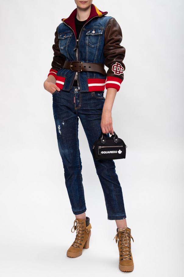 Blue, maroon and yellow denim jacket from Dsquared2. Trimmed with brown faux leather, this garment features a two-way zip fastening, two buttoned flap pockets, two slip pockets, sewn-on logo detail in green and white at the back and ribbed trims in red and white at the hem and cuffs.
