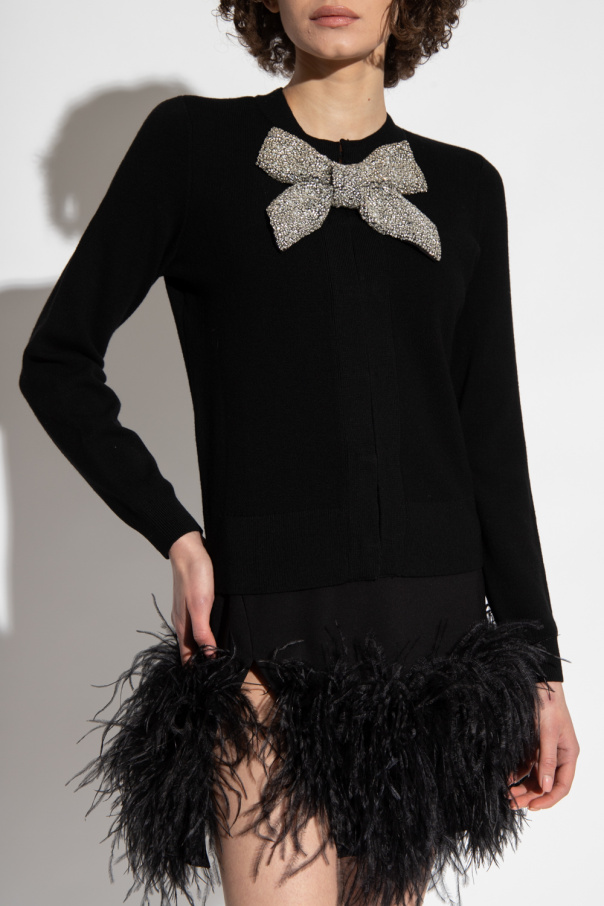 Black cardigan from Kate Spade. Made of wool, this long sleeve design features hook fastenings, detachable silver-tone bow with sparkling appliqués and ribbed trims at the crew neck, hem and cuffs.