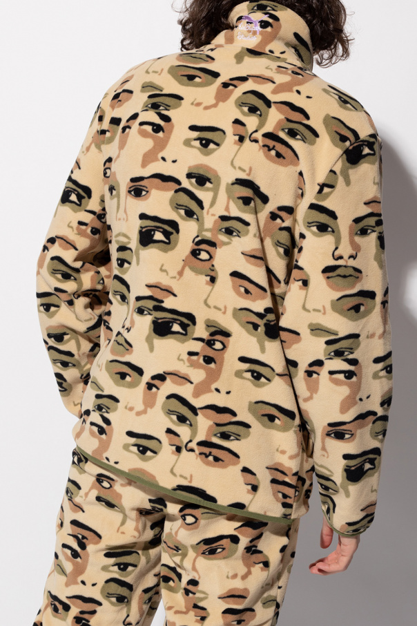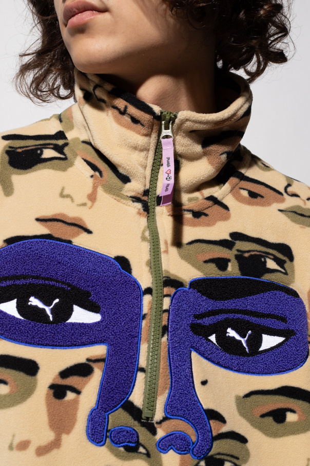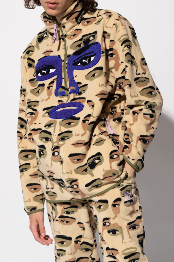Beige and green sweatshirt from Puma x Kidsuper Studios. Made of fleece, this design features a zip fastening, navy and black textured patch with a white logo embroidery, printed pattern and two zip pockets.
