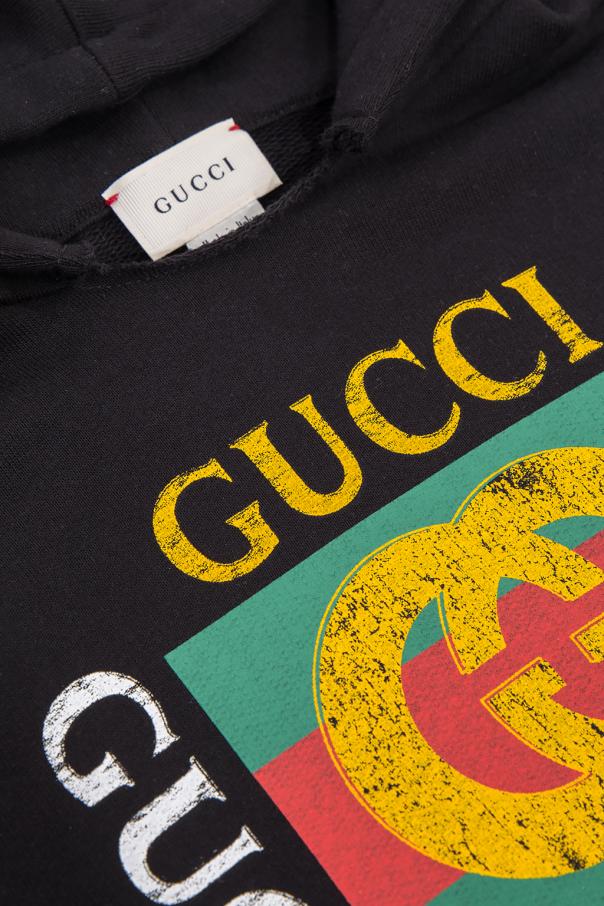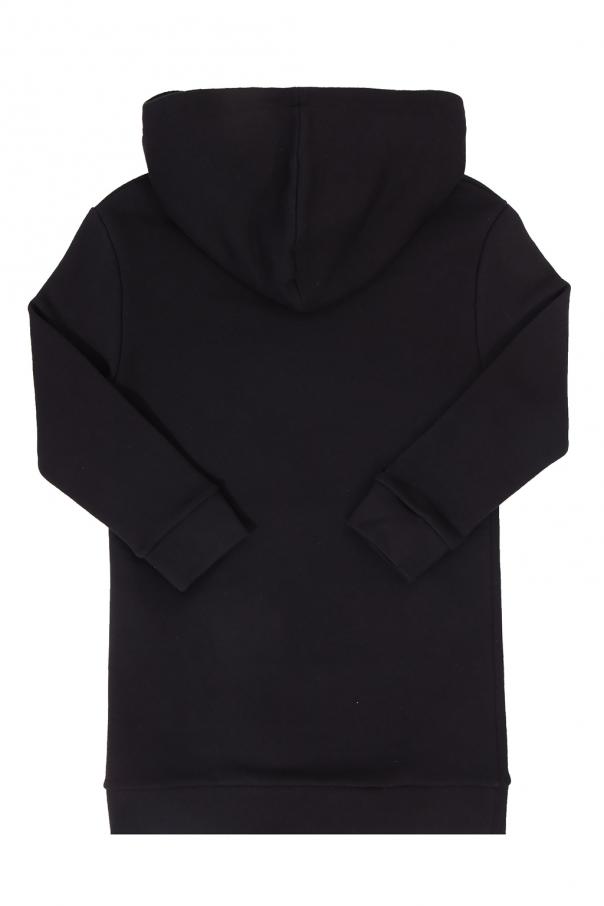 Black, cotton, sweatshirt dress with a hood from Gucci. On the front a print including a yellow and white logo, as well a 'Web' stripe characteristic for the brand in green-red-green. Two inset pockets. Bottom and sleeves finished with welts.