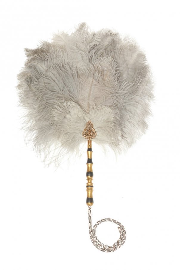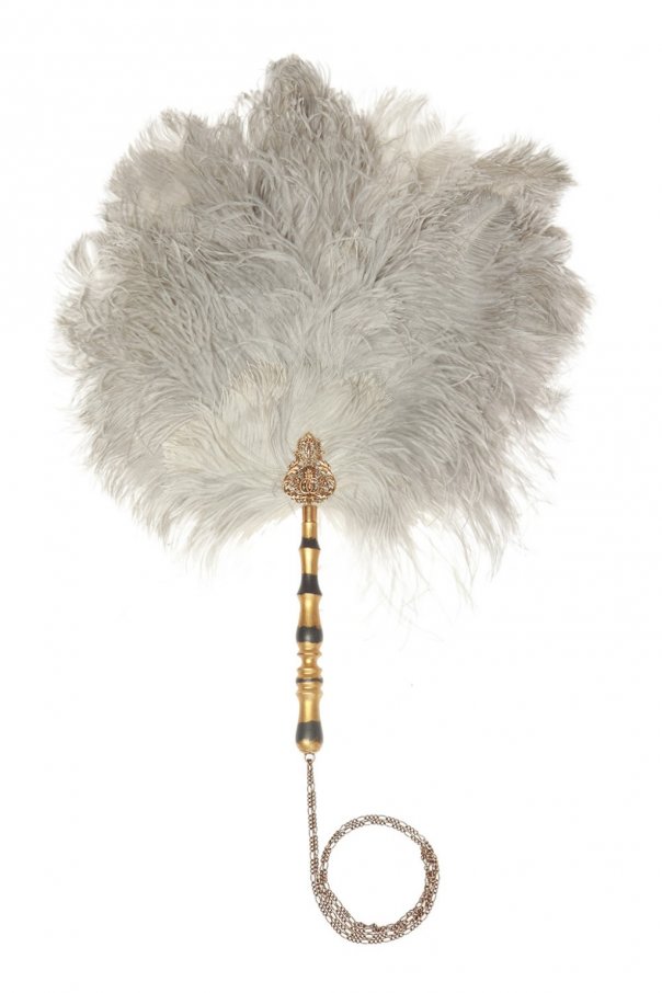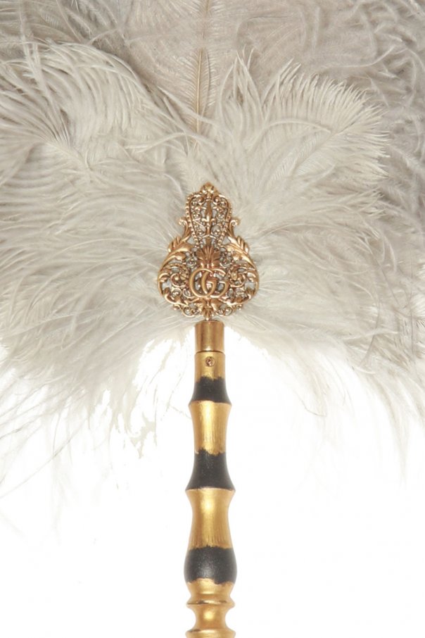 Grey fan from Gucci. Made ostrich feathers. Gold-tone and grey metal handle. Decorated with an embossed pattern and a logo. Finished with a chain.