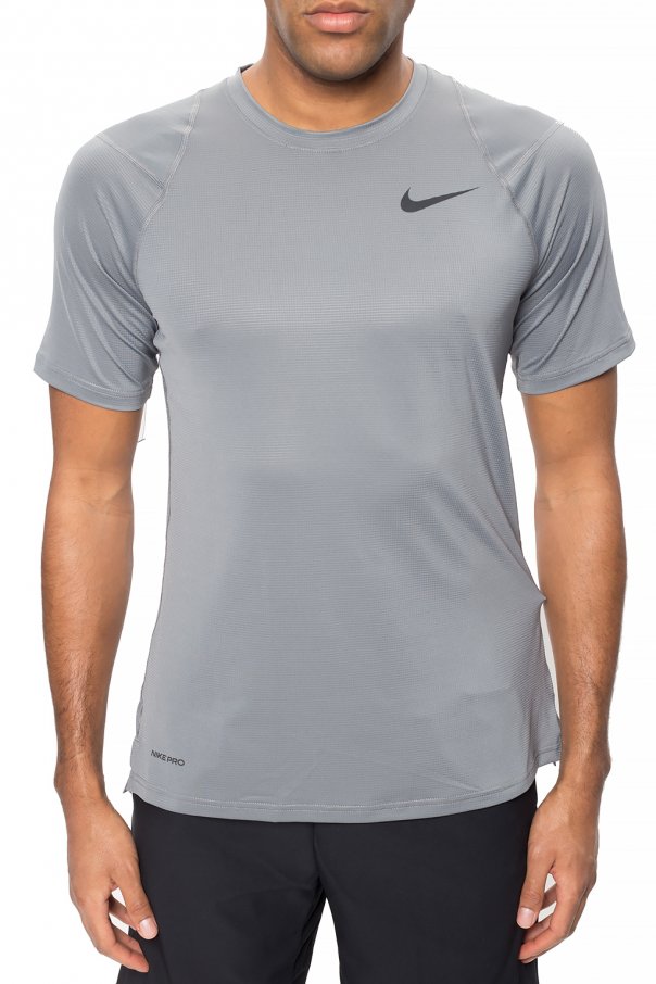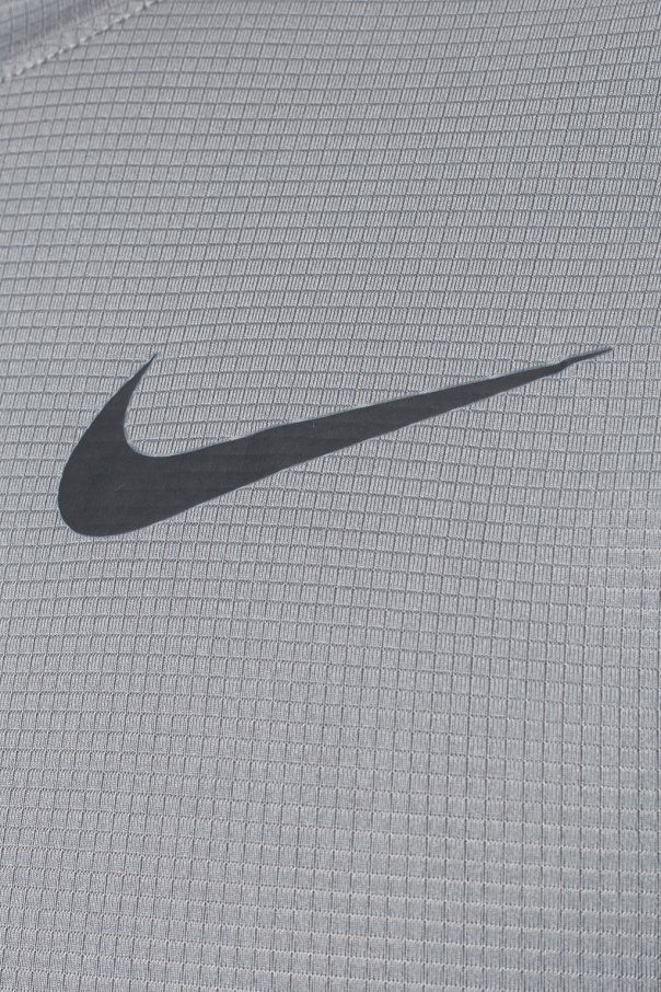 Grey performance T-shirt from Nike. Made of stretchy fabric with sweat-wicking Dri-FIT technology. Black logo print on the front.