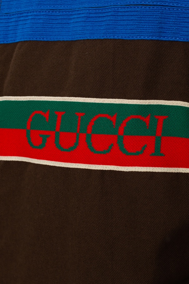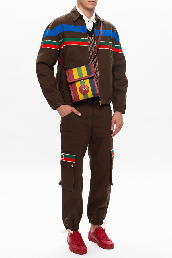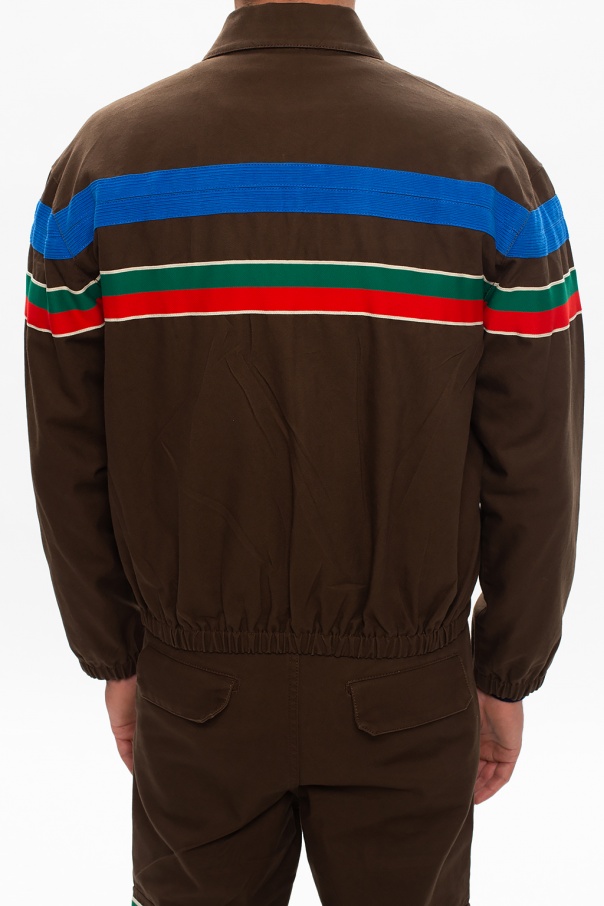 Brown jacket from Gucci. Crafted from cotton, this item features a zip fastening, decorative buttons, a blue tape detail, red and green logo stripes, two slip pockets as well as elasticated waist and cuffs.