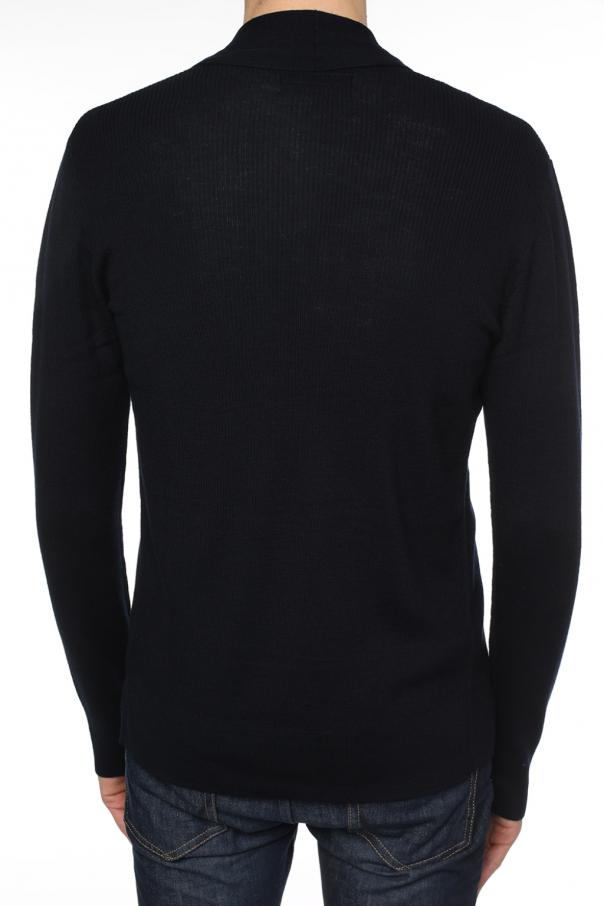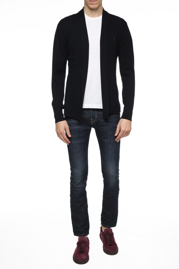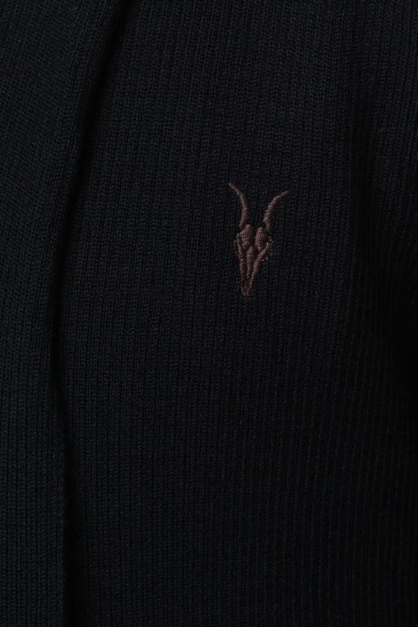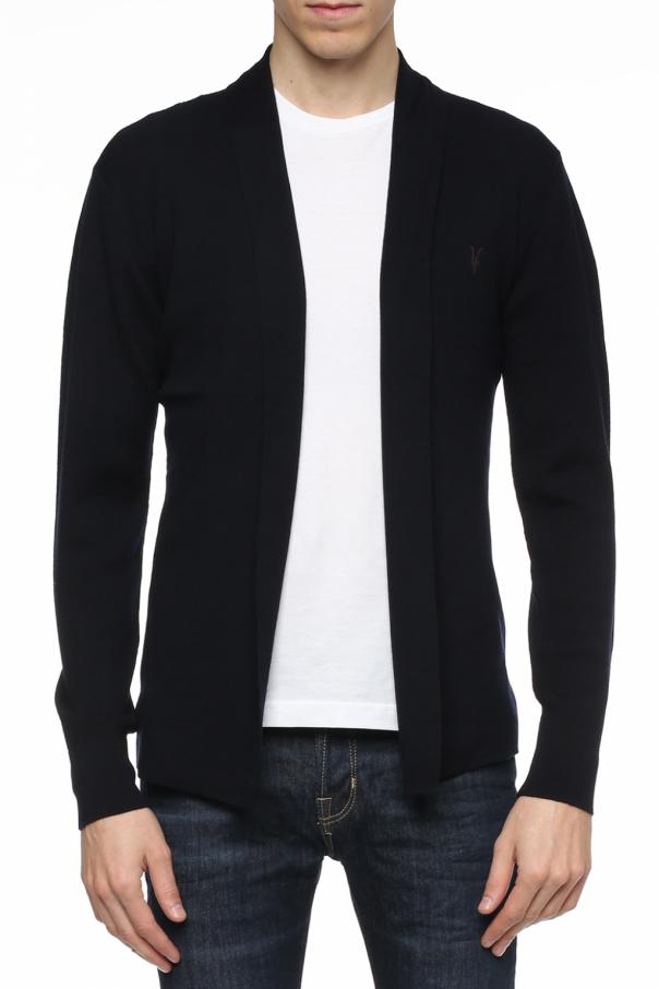 Navy 'Mode' cardigan from AllSaints. Made of merino wool. Decorated with embroidered grey logo at front. Elasticated cuffs.