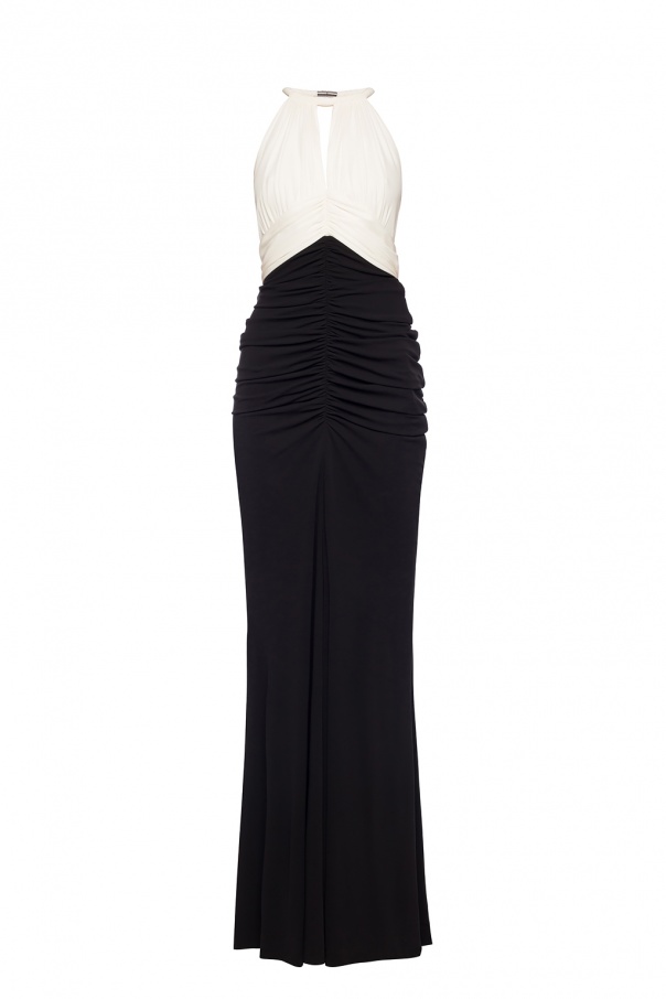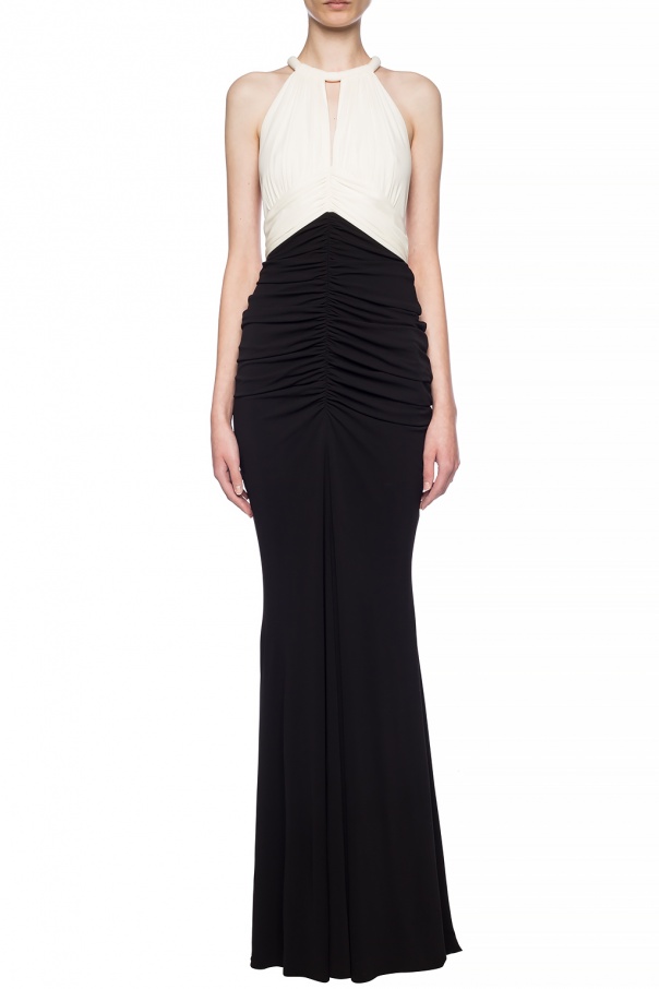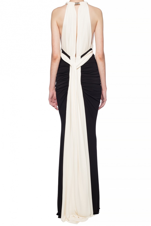 Long black and cream sleeveless dress from Alexander McQueen featuring zip and hook & eye closures on the back, split neckline, textile inserts and ruched sides.