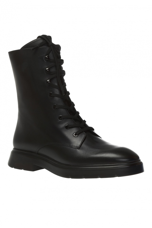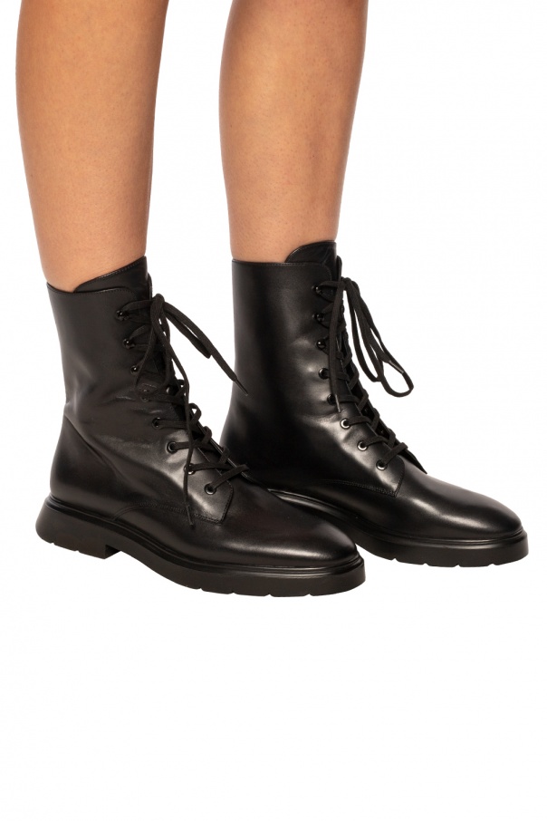 Black ‘Mckenzie’ ankle boots from Stuart Weitzman. Made of leather. Embellished with tonal topstitching. Feature lace-up closure and black rubber sole.
