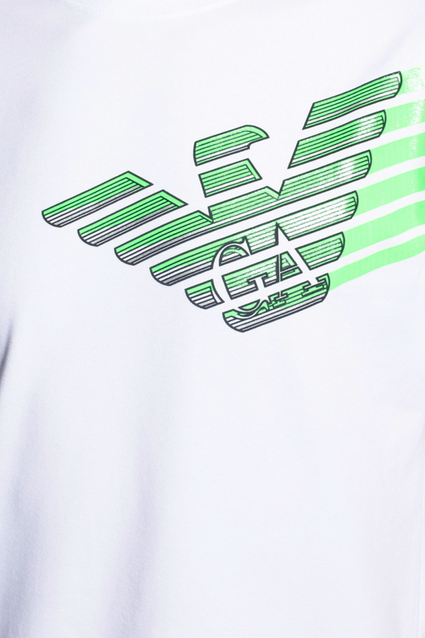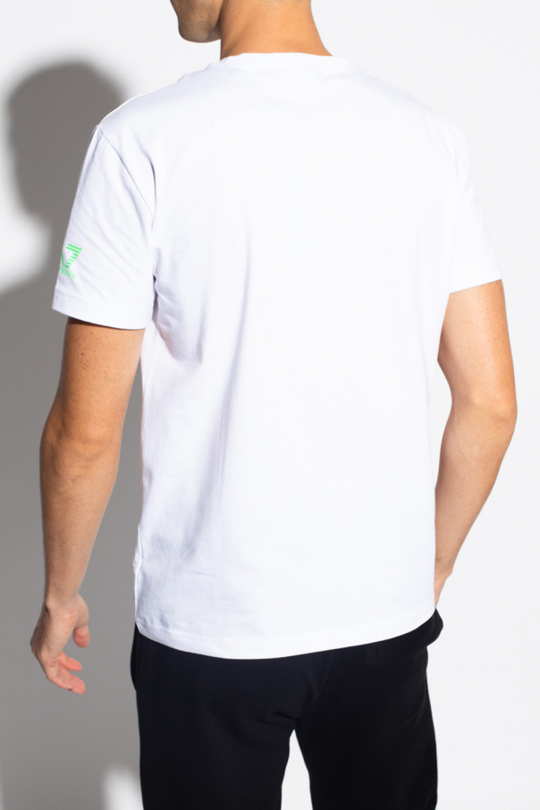 White T-shirt from EA7 Emporio Armani. Made of cotton, this short sleeve design features a ribbed round neck and a printed logo pattern in green and black.