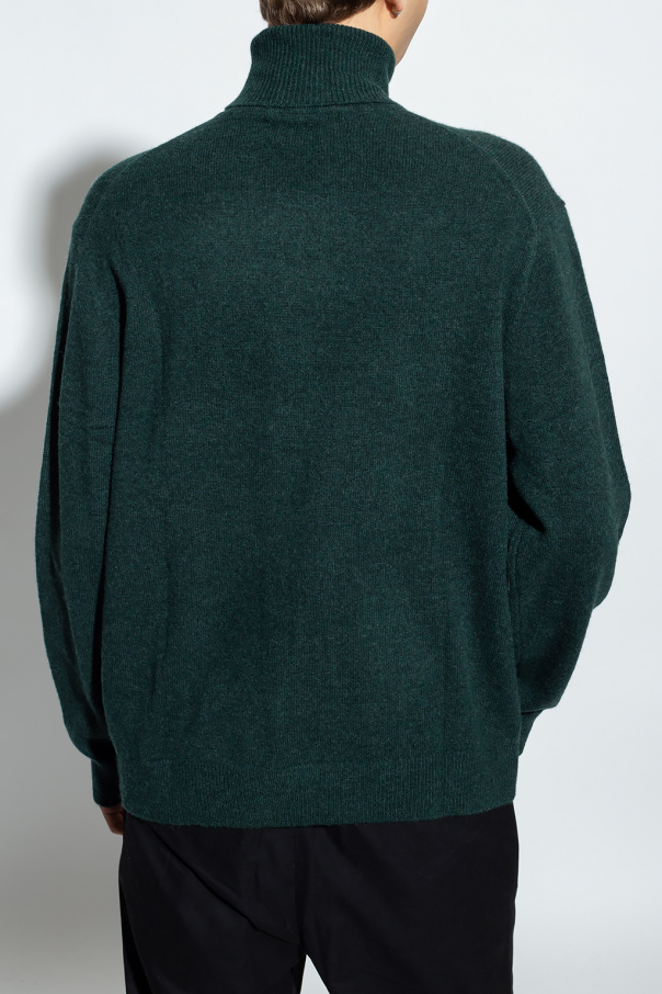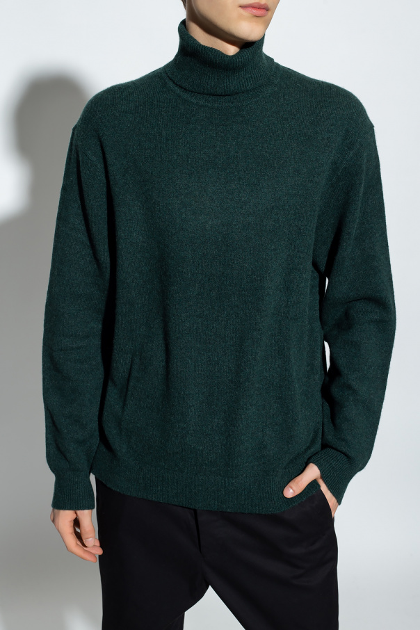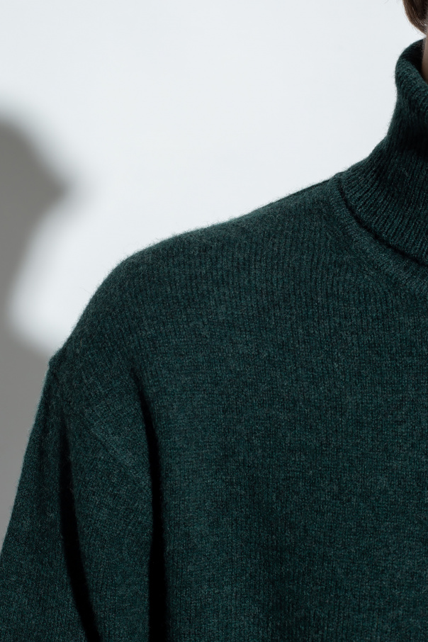 Dark green turtleneck sweater from Samsoe Samsoe. Made of wool, this style features a relaxed fitting silhouette, a snug collar and ribbed hems.