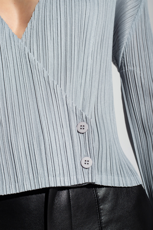 Grey pleated cardigan from Issey Miyake Pleats Please. Crafted with a double-breasted silhouette, this style features button fastenings, a V-neckline and long sleeves.