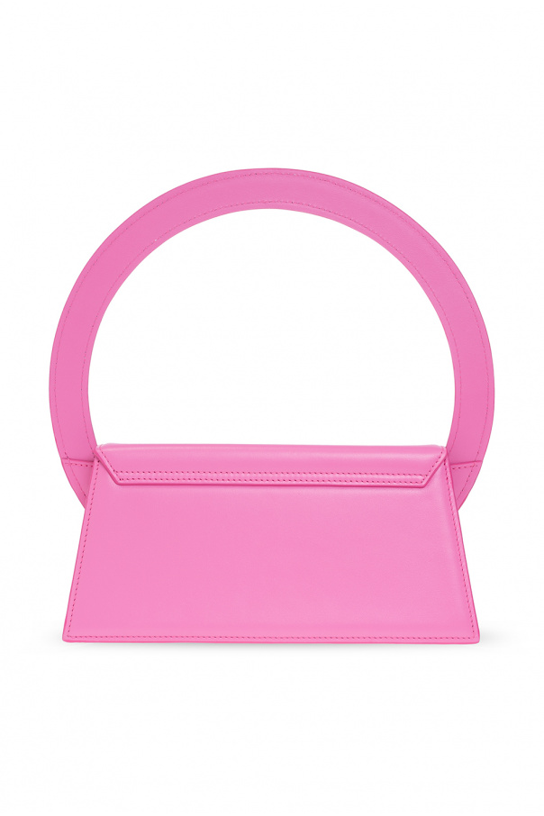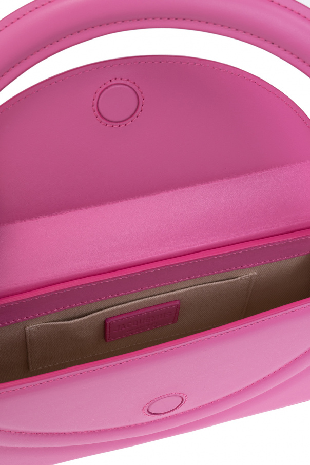 Pink ‘Rond’ handbag from Jacquemus. Made of cow leather, this design secures with a magnetic snap and features a gold-tone logo plaque, a round rigid handle, a detachable shoulder strap, gold-tone metal hardware and a beige cotton clad interior with one compartment and one slip pocket.