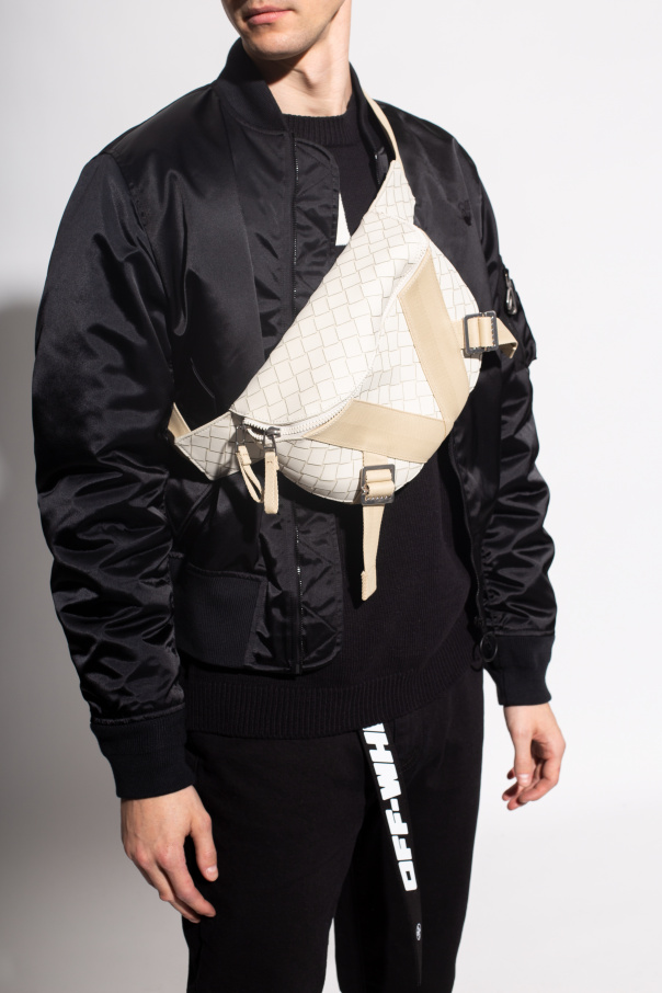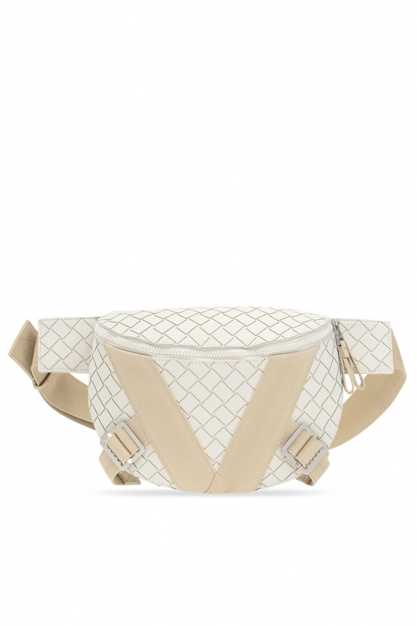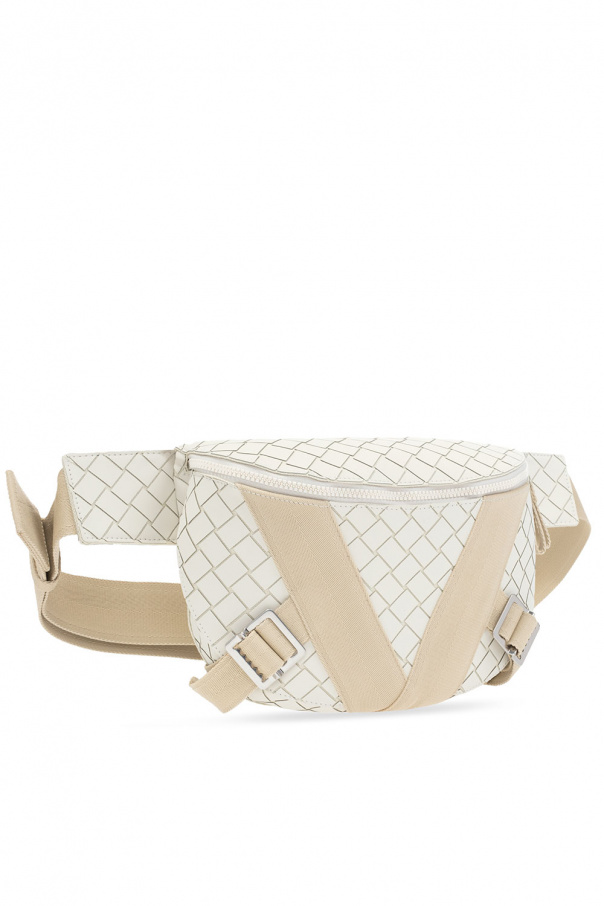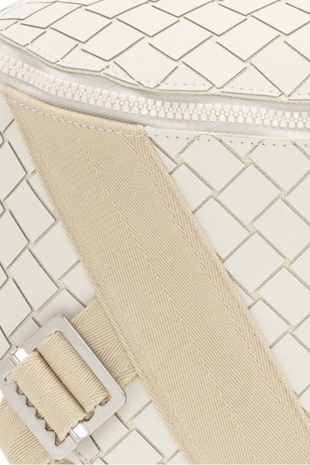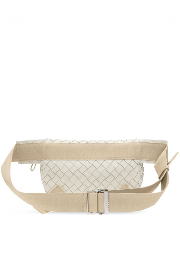 Beige belt bag from Bottega Veneta. Enriched by a laser-cut Intrecciato pattern, this design secures with a zip and features decorative buckle straps on the front, an adjustable strap, silver-tone metal hardware and one internal compartment.